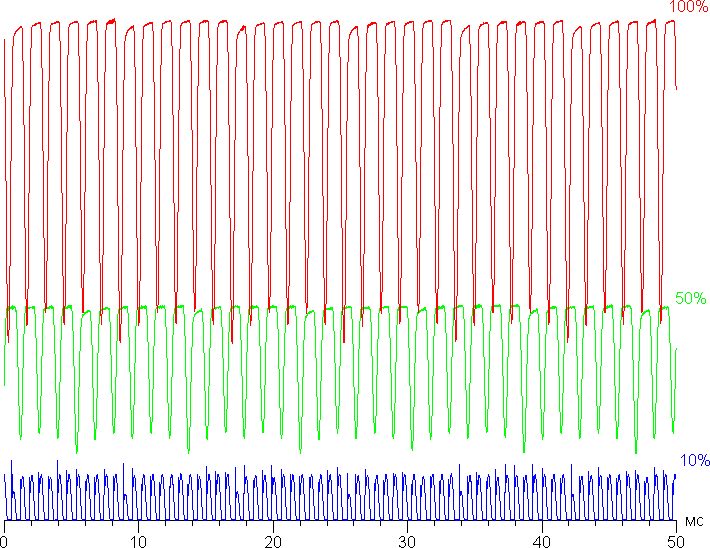 На высоком и среднем уровне яркости присутствует значимая модуляция с частотой примерно 720 Гц. На рисунке ниже приведены зависимости яркости (вертикальная ось) от времени (горизонтальная ось) для нескольких значений настройки яркости для режима с частотой обновления 60 Гц:
