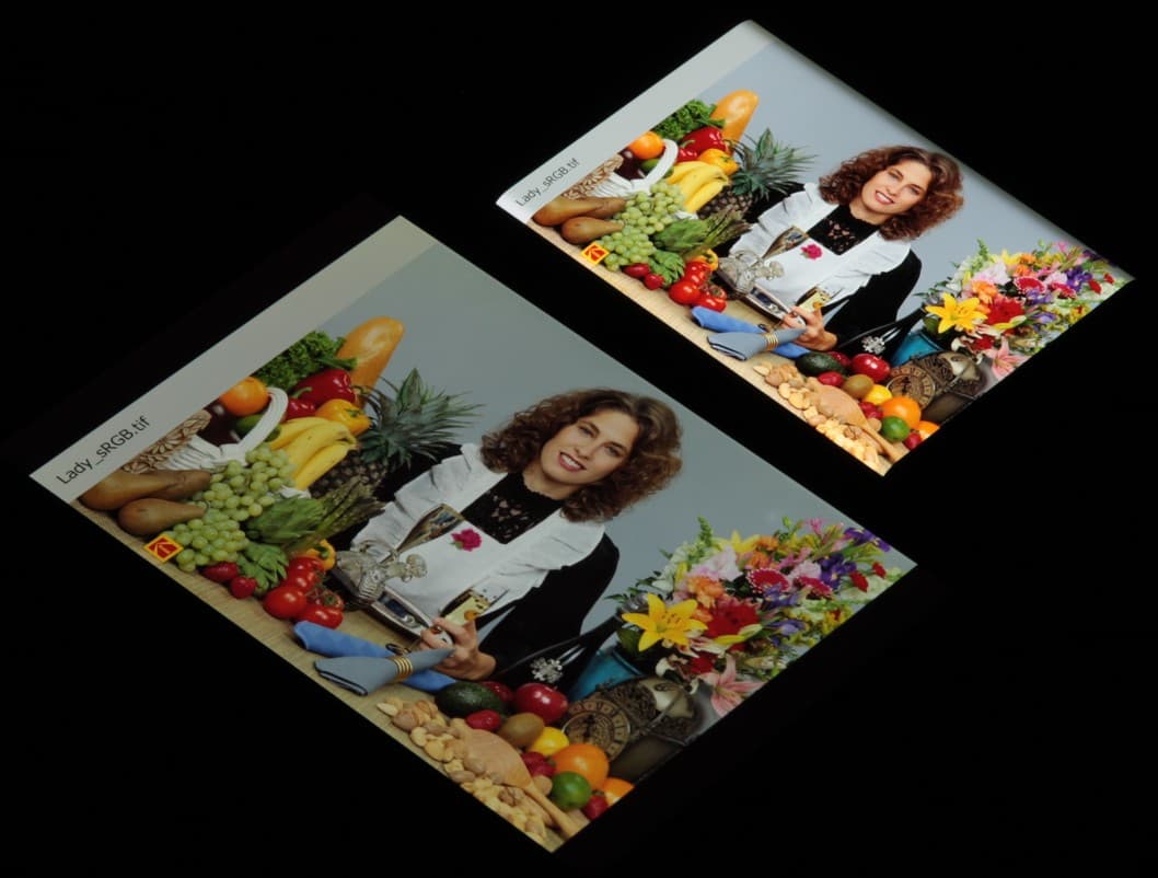 Согласно визуальной оценке, цвета у тестируемого экрана более-менее естественные, а цветовой баланс экранов немного различается. Напомним, что фотография не может служить надежным источником сведений о качестве цветопередачи и приводится только для условной наглядной иллюстрации. В частности, выраженный красноватый оттенок белого и серого полей, присутствующий на фотографиях тестируемого экрана, при перпендикулярном взгляде визуально отсутствует, что подтверждается аппаратными тестами с помощью спектрофотометра. Причина в том, что спектральная чувствительность матрицы фотоаппарата неточно совпадает с этой характеристикой человеческого зрения. Заметим, что в данном случае картинка занимает в высоту (при ландшафтной ориентации экрана) всю доступную для вывода изображения область и заходит на загнутые края экрана, что приводит к легкому затемнению и искажению цвета. Также на свету эти области почти всегда бликуют, что еще больше мешает при просмотре изображений, выведенных на весь экран. И даже картинка фильмов с соотношением сторон 16:9 заходит на загибы, что мешает при просмотре кино.