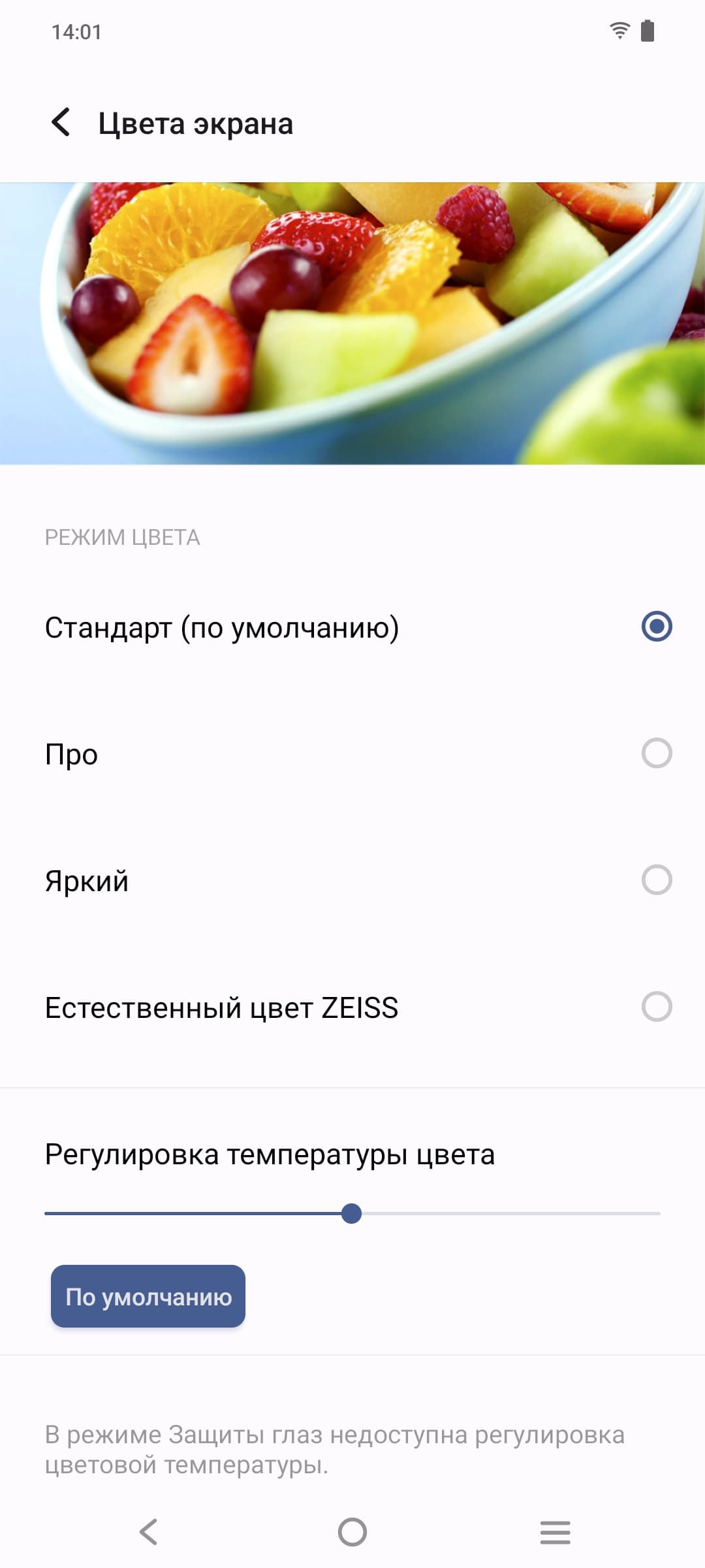Разумеется, присутствует настройка (Защита глаз), позволяющая снизить интенсивность синей компоненты: