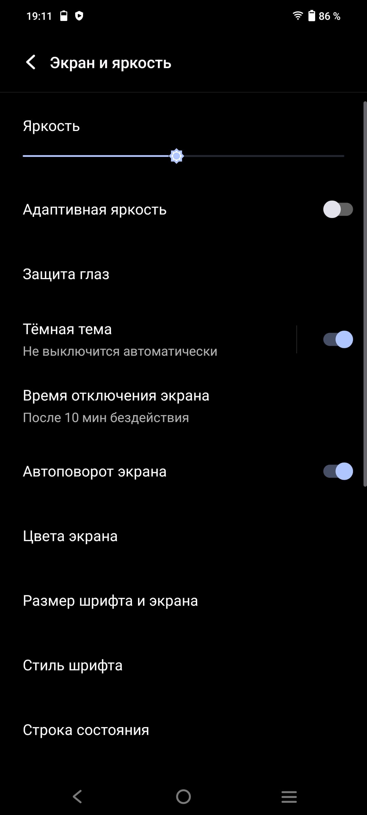 При ручном управлении яркостью и при выводе белого поля во весь экран максимальное значение яркости составило примерно 490 кд/м² в обычных условиях, на очень ярком свету оно повышается до 960 кд/м². Максимальная яркость очень высокая. В данном случае чем меньше площадь белого на экране, тем он светлее, то есть фактическая максимальная яркость белых участков будет почти всегда еще выше. В итоге, учитывая отличные антибликовые свойства, читаемость днем на солнце, должна быть на хорошем уровне, а темная тема не только экономит заряд аккумулятора, но способствует лучшей разборчивости информации на экране в условиях высокой освещенности. Минимальное значение яркости — 2 кд/м², то есть пониженный уровень яркости без проблем позволяет использовать устройство даже в полной темноте. Есть автоматическая регулировка яркости по датчику освещенности (он расположен под экраном близко к верхнему краю правее центра по горизонтали). В автоматическом режиме при изменении внешних условий освещенности яркость экрана как повышается, так и понижается. Работа этой функции зависит от положения ползунка регулировки яркости: им пользователь может попытаться выставить желаемый уровень яркости в текущих условиях. Если оставить все по умолчанию, то в полной темноте функция автояркости уменьшает яркость до 7 кд/м² (темновато), в условиях освещенного искусственным светом офиса (примерно 550 лк) устанавливает на 100 кд/м² (сойдет), а условно под прямыми лучами солнца повышает до 960 кд/м² (до максимума, так и нужно). Результат нас не совсем устроил, поэтому в полной темноте мы чуть увеличили яркость, получив в итоге для трех условий, указанных выше, следующие значения: 10, 100 и 960 кд/м² (идеальное сочетание). Получается, что функция автоподстройки яркости работает адекватно и позволяет пользователю настраивать свою работу под индивидуальные требования.
