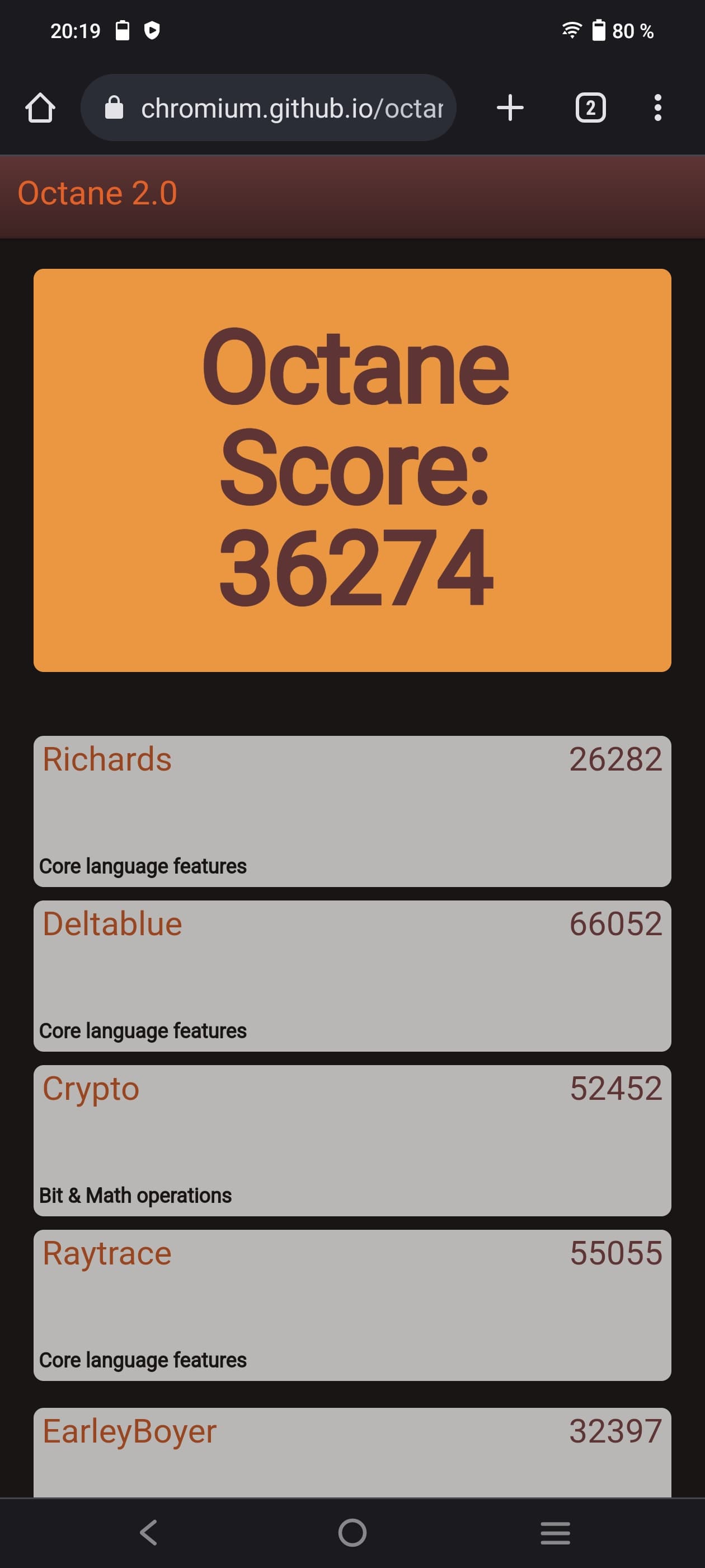 | Google Octane 2 (больше — лучше) | 36274 | 27234 | 59248 | 30430 | 54735 |