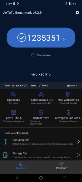 В тесте AnTuTu она выдает максимальные цифры, да и в остальных бенчмарках — игровых и браузерных — демонстрирует максимальные результаты, сопоставимые с флагманской Qualcomm Snapdragon 8 Gen2. Интерфейс отзывается без задержек, приложения открываются мгновенно, любые игры работают без притормаживаний.