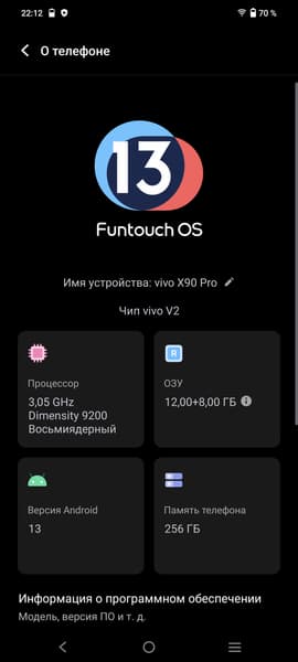 В качестве программной платформы Vivo X90 Pro использует версию ОС Android 13 с собственной оболочкой Funtouch 13 (в глобальной версии). Интерфейс у смартфонов Vivo всегда был своеобразным, с немного иной организацией, не самый интуитивно понятый — но привыкнуть можно. Настроек, режимов, жестов здесь максимально много. Магазина Google Play у нашей версии смартфона изначально не было, но при желании его можно установить.