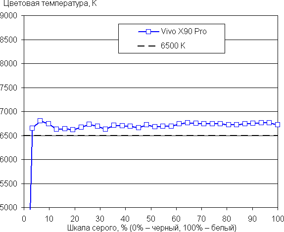 Даже в случае отсутствия коррекции баланс оттенков на шкале серого в случае профиля Про хороший, так как цветовая температура близка к стандартным 6500 К, а отклонение от спектра абсолютно черного тела (ΔE) ниже 10 единиц, что для потребительского устройства считается приемлемым показателем. При этом цветовая температура и ΔE мало изменяются от оттенка к оттенку — это положительно сказывается на визуальной оценке цветового баланса: