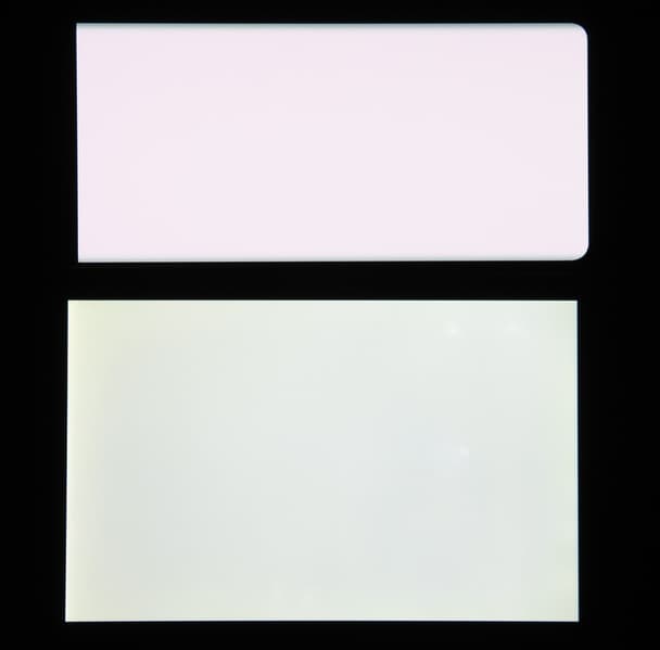 Экран характеризуется великолепными углами обзора. Правда, белый цвет при отклонении на большие углы приобретает легкий сине-зеленый оттенок, но черный цвет остается просто черным под любыми углами. Он настолько черный, что параметр контрастности в данном случае просто неприменим. Для сравнения приведем фотографии, на которых на экраны Vivo X90 Pro и второго участника выведены одинаковые изображения, при этом яркость экранов изначально установлена примерно на 200 кд/м², а цветовой баланс на фотоаппарате принудительно переключен на 6500 К.
