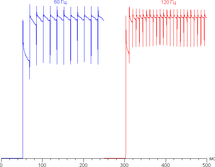 В режиме 120 Гц плавность прокрутки списков меню заметно повышается. Посмотрим, изменится ли при этом характер модуляции: