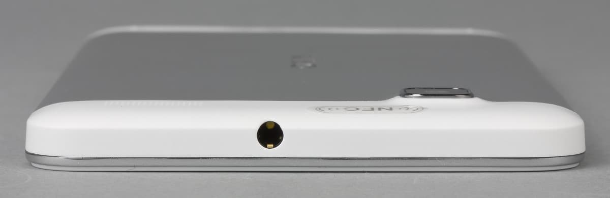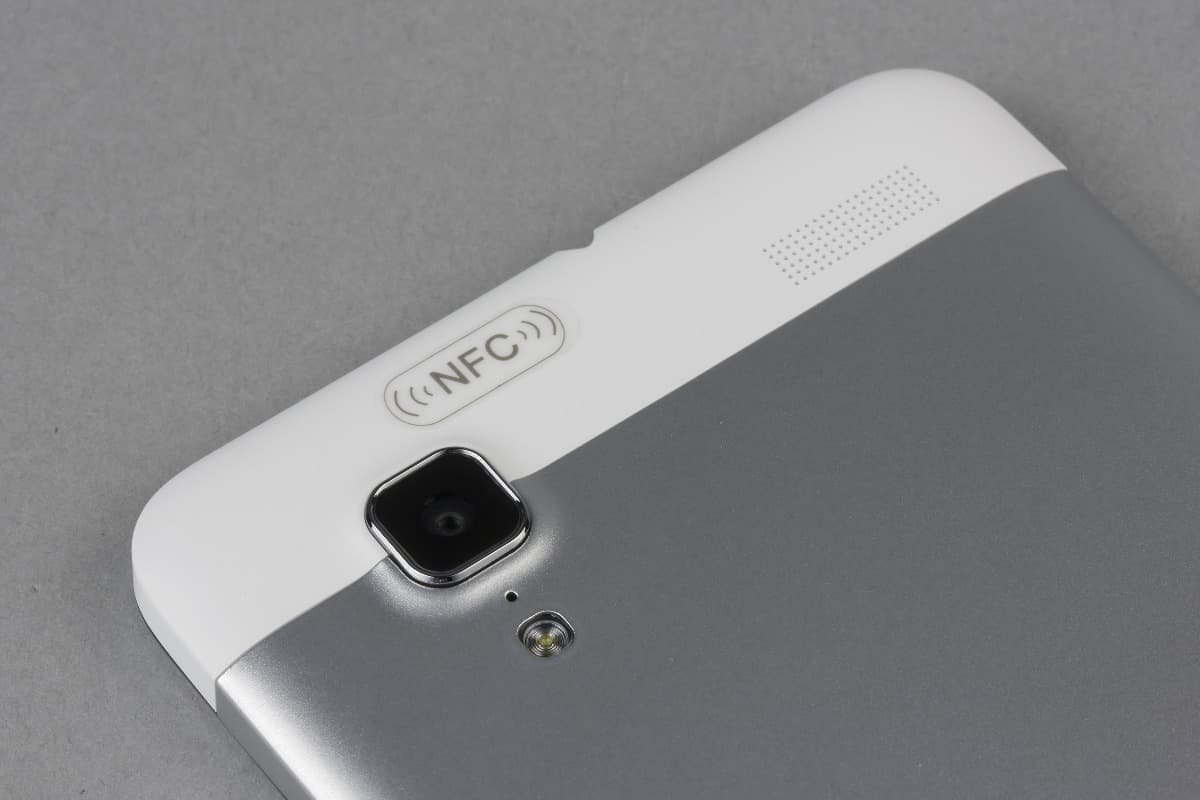 В верхней части задней панели установлена основная камера с дополнительным микрофоном и светодиодной вспышкой. Она немного выступает из корпуса и имеет тонкую немного выступающую рамку. В центре металлической вставки блестит логотип производителя. Скорее всего, он выполнен из пластика и просто покрашен. На фотографии видна наклейка NFC, она просто указывает место размещения антенны, и ее, конечно, можно снять.