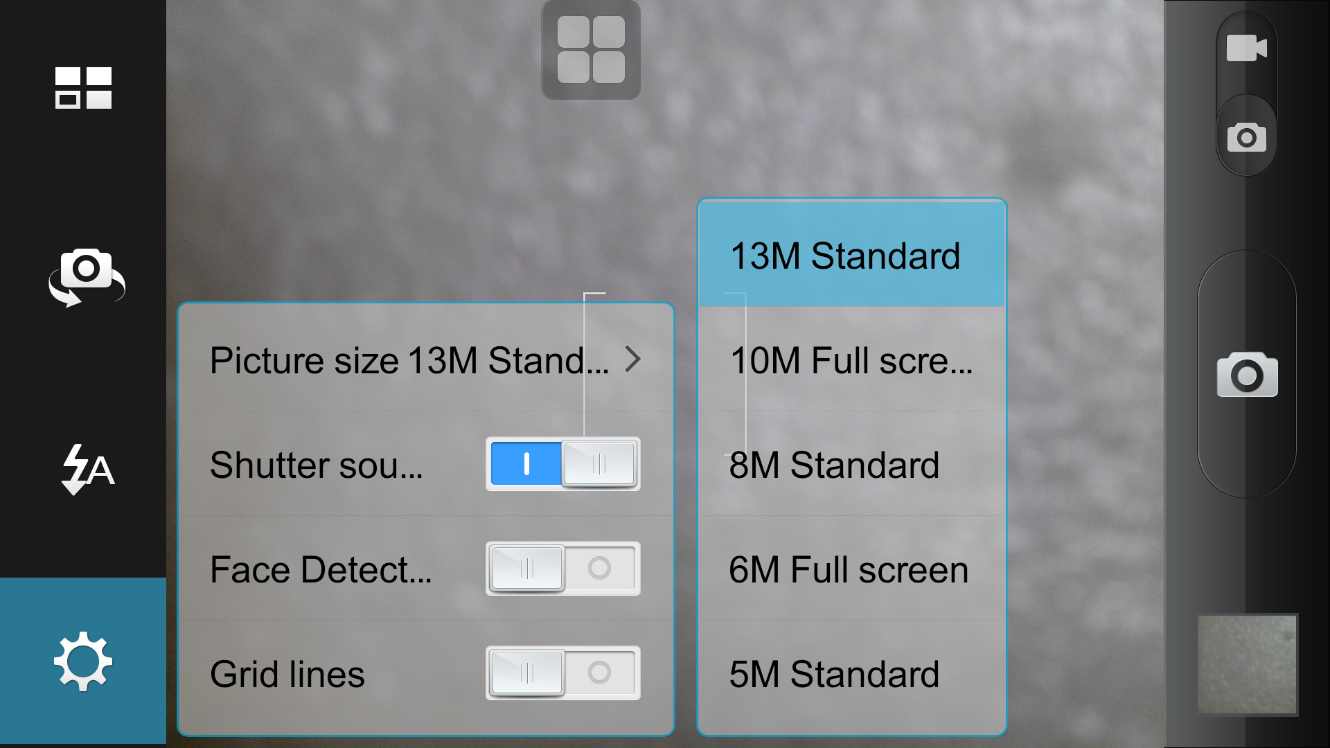 В случае фоторежима есть выбор режима фотосъемки (обычный, панорама, HDR, Face Beauty), вызов настроек и управление вспышкой (для внешней камеры). Настроек кстати не очень много — установка разрешения и формата, звук затвора, определение лиц, сетка.