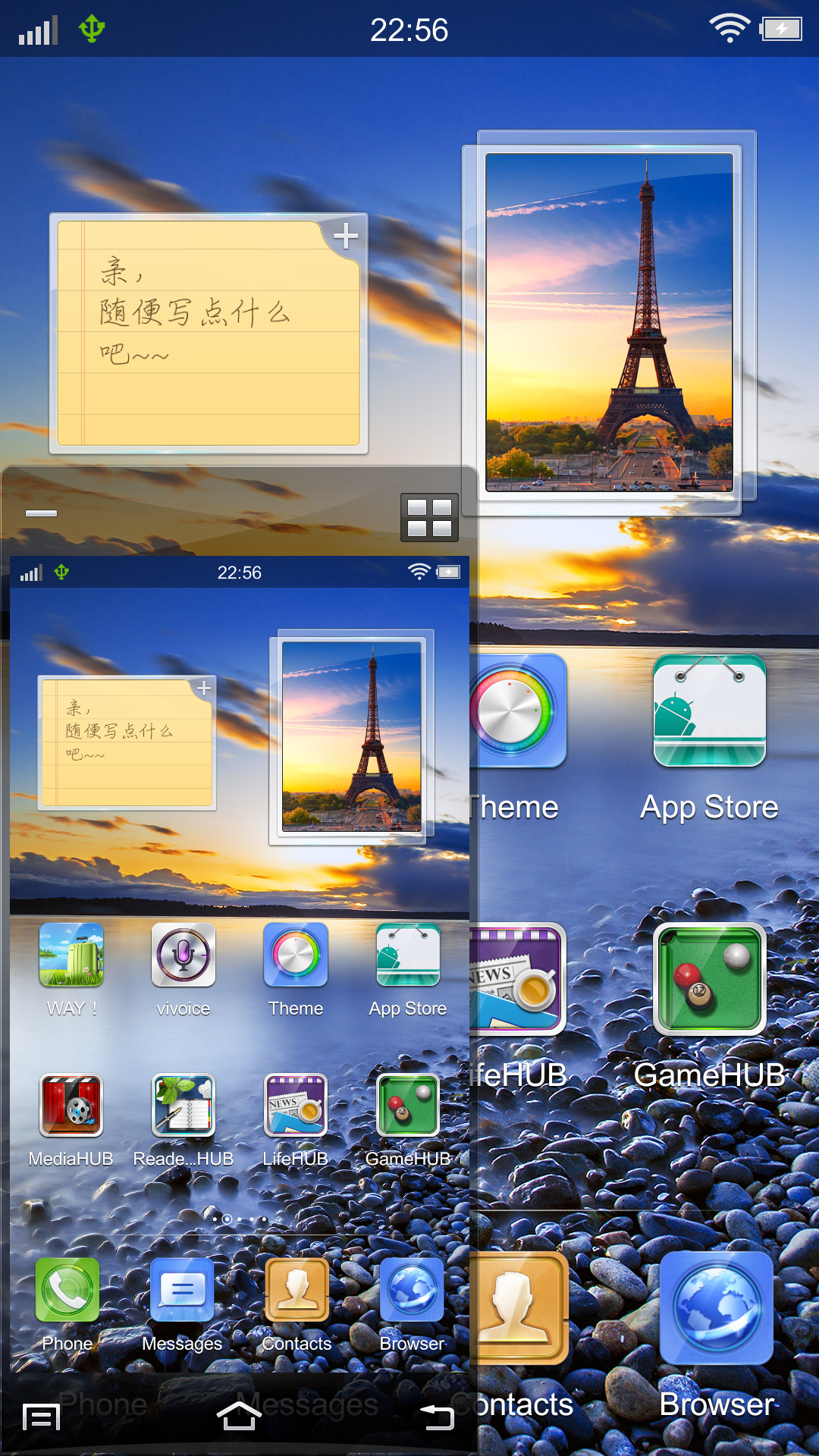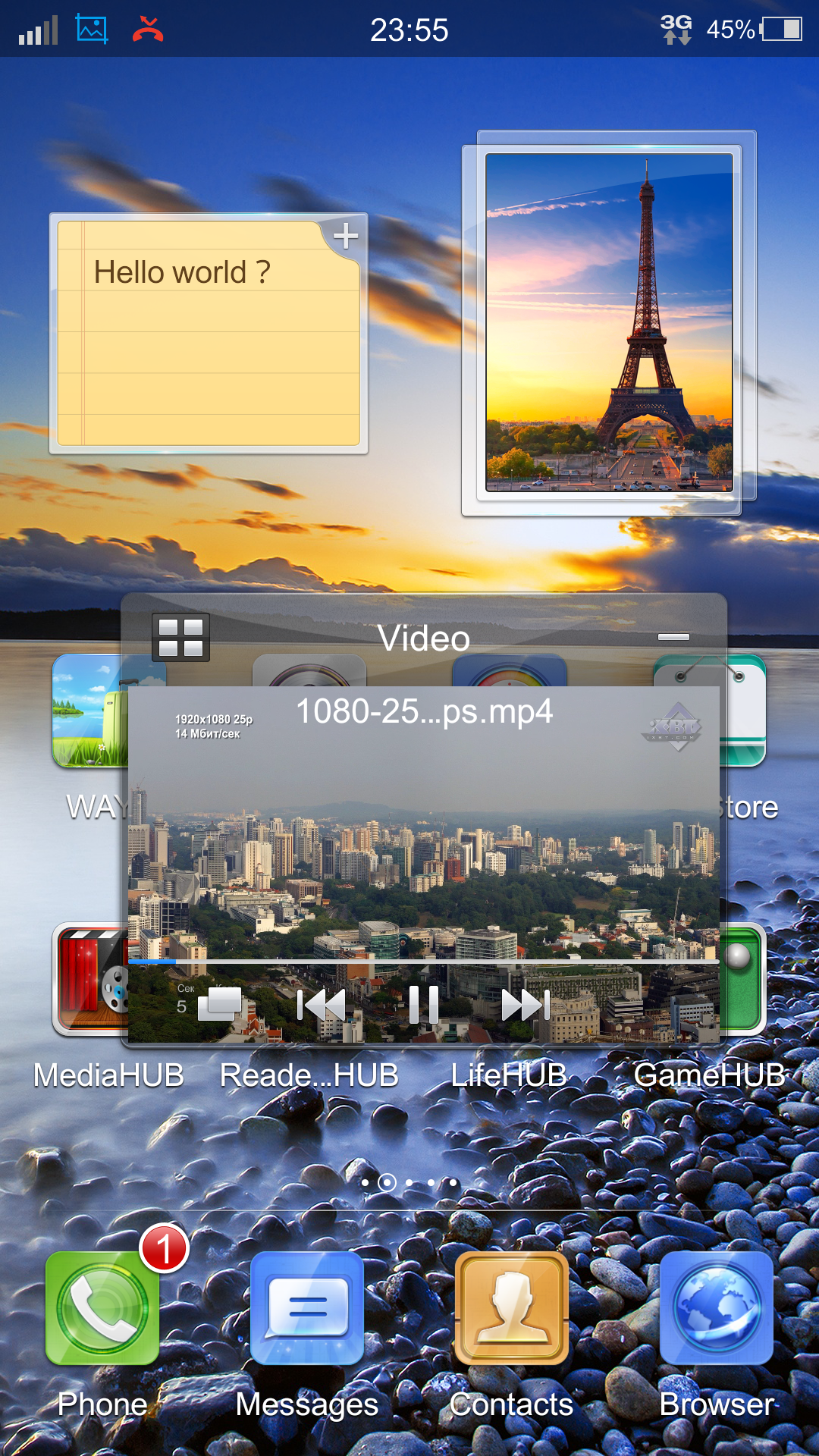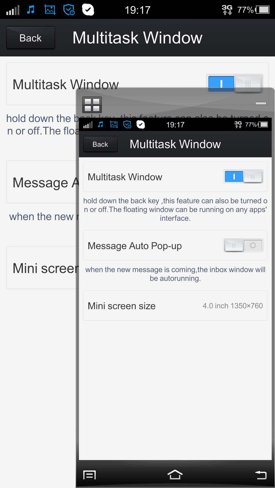 Также полезной будет утилита «Multitask Window», которая также показывает свое окно поверх основного. Из него можно вызвать «Мини экран» и «оконные» версии видео и аудиоплееров, заметок, папки входящих SMS. Некоторые встроенные утилиты имеют поддержку специальных режимов ввода одной рукой, в частности это клавиатура, номеронабиратель, экран блокировки.
