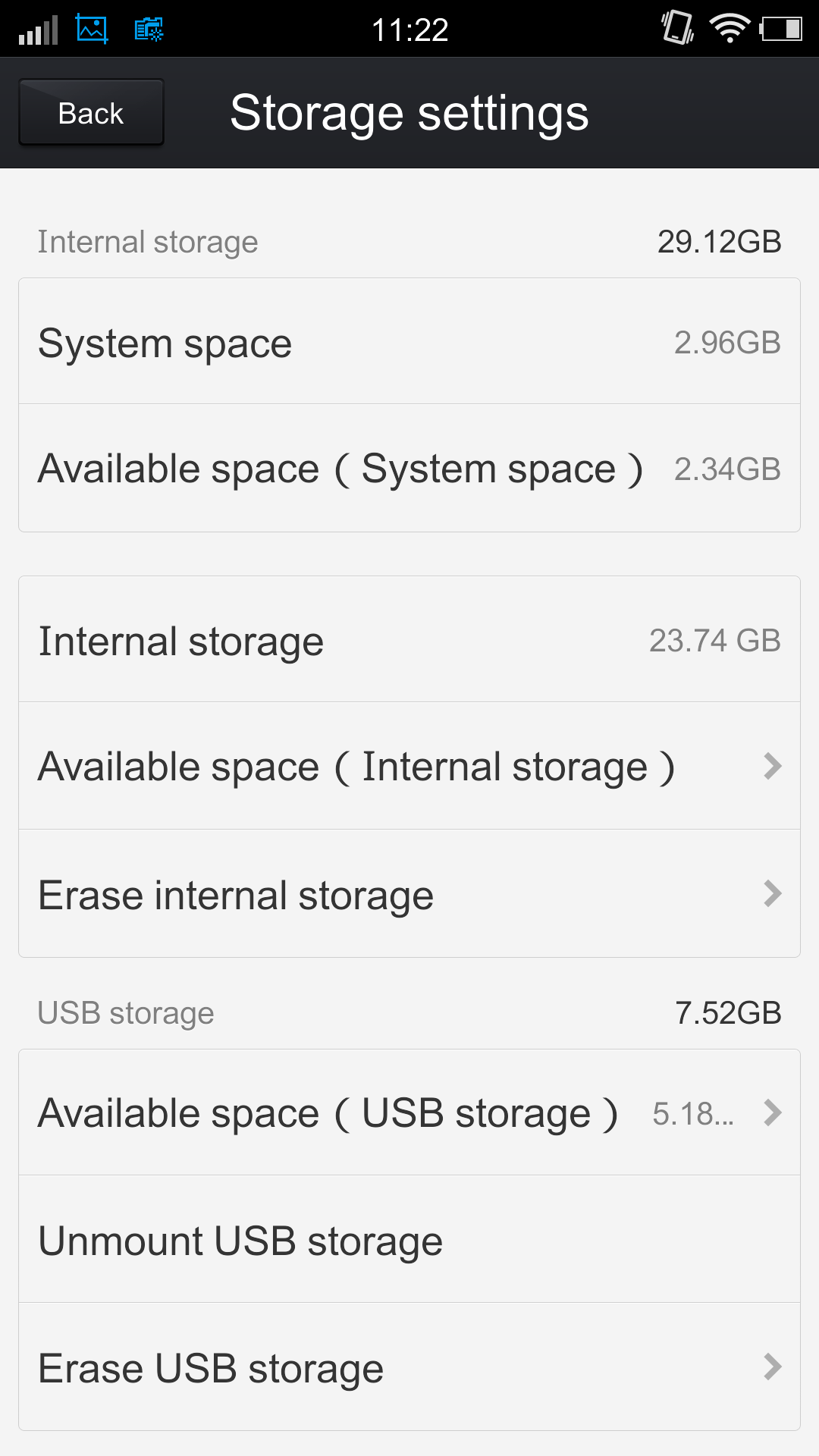 Смартфон использует платформу Qualcomm Snapdragon 600 (APQ8064T), которую мы встречали ранее в нескольких продуктах, например Samsung Galaxy S4 Active, HTC One и Xiaomi Mi2S. Она интересна наличием четырех ядер Krait 300, работающих в данном устройстве на частоте 1,7 ГГц. При этом при отсутствии нагрузки они способны снижать свою скорость до 384 МГц и даже совсем отключаться. Объем оперативной памяти составляет 2 ГБ, для хранения данных и системы предусмотрено 32 ГБ флэшпамяти. Из этого объема пользователю доступно на новом устройстве 23,7 ГБ. Необычно то, что вся память представлена одним блоком, без выделения отдельного раздела для эмулируемой карты памяти. Поддержки microSD в этой модели нет, но есть USB OTG. Так что в целом получаем компромиссное решение. Доступ к памяти возможен в нескольких режимах, включая вариант USB-накопителя и MTP. Учитывая, что в качестве файловой системы используется FAT32, максимальный объем записываемого файла не может превышать 4 ГБ. Но на внешних накопителях можно использовать и NTFS, снимающую это ограничение (запись тоже поддерживается).