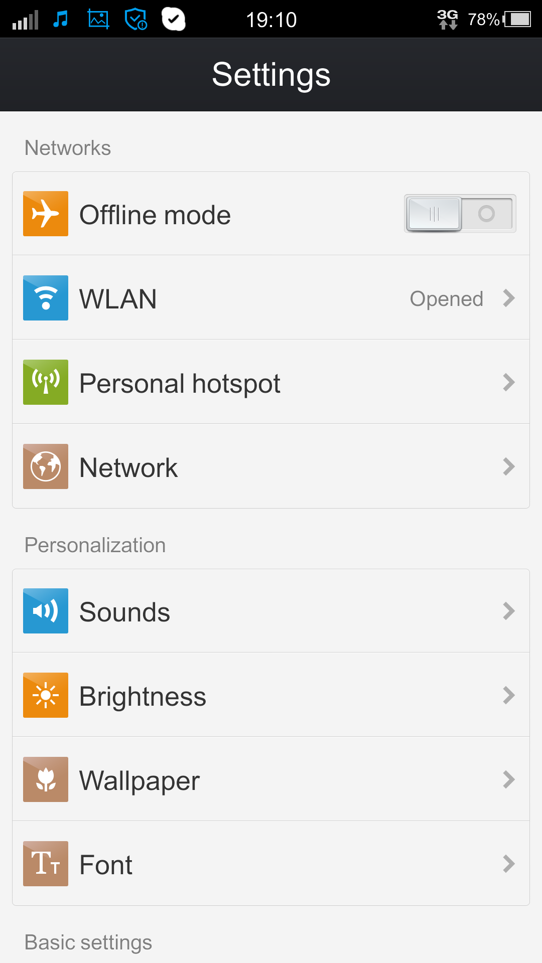 Внимания заслуживает и утилита изменения настроек смартфона. В ней на паре экранов представлены наиболее часто используемые опции, включая режим полета, Wi-Fi, точка доступа, передача данных, звуки, яркость, настройки телефона, аккаунты и синхронизация, описанный выше раздел «Smart» и некоторые другие. Здесь стоит упомянуть поддержку расписаний работы смартфона и включения некоторых режимов (вибрация, полет). Все, что нужно пользователю реже, спрятано в «More settings». Обратите внимание, что четырнадцатый пункт здесь — как раз изменения языка интерфейса. Найти его при отсутствии поясняющих значков непросто.