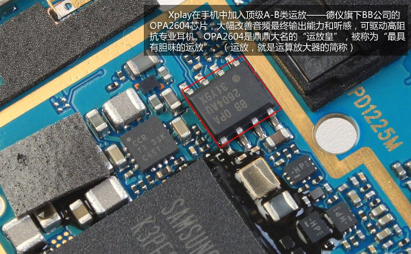 В преобразователе ток—напряжение стоит операционный усилитель TI OPA2604. Данный ОУ предназначается для профессиональной аппаратуры и имеет рекордно низкое количество шумов и искажений: в частности, Кг<0,0003%. Интересно, что на плате также установлен асинхронный преобразователь частоты дискретизации CS8422. Он используется как промежуточный интерфейс между SoC Qualcomm Snapdragon 600 и ЦАП CS4398, так как отправить звук напрямую на ЦАП нет технической возможности.