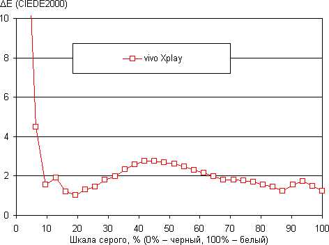 В итоге визуально изображения на экране имеют насыщенность близкую к естественной. Баланс оттенков на шкале серого отличный, так как цветовая температура близка к стандартным 6500 К, и отклонение от спектра абсолютно черного тела (дельта Е) на большей части шкалы серого меньше 3, что считается хорошим показателем даже для профессионального устройства. (Темные области шкалы серого можно не учитывать, так как там баланс цветов не имеет большого значения, да и погрешность измерений цветовых характеристик на низкой яркости большая.)