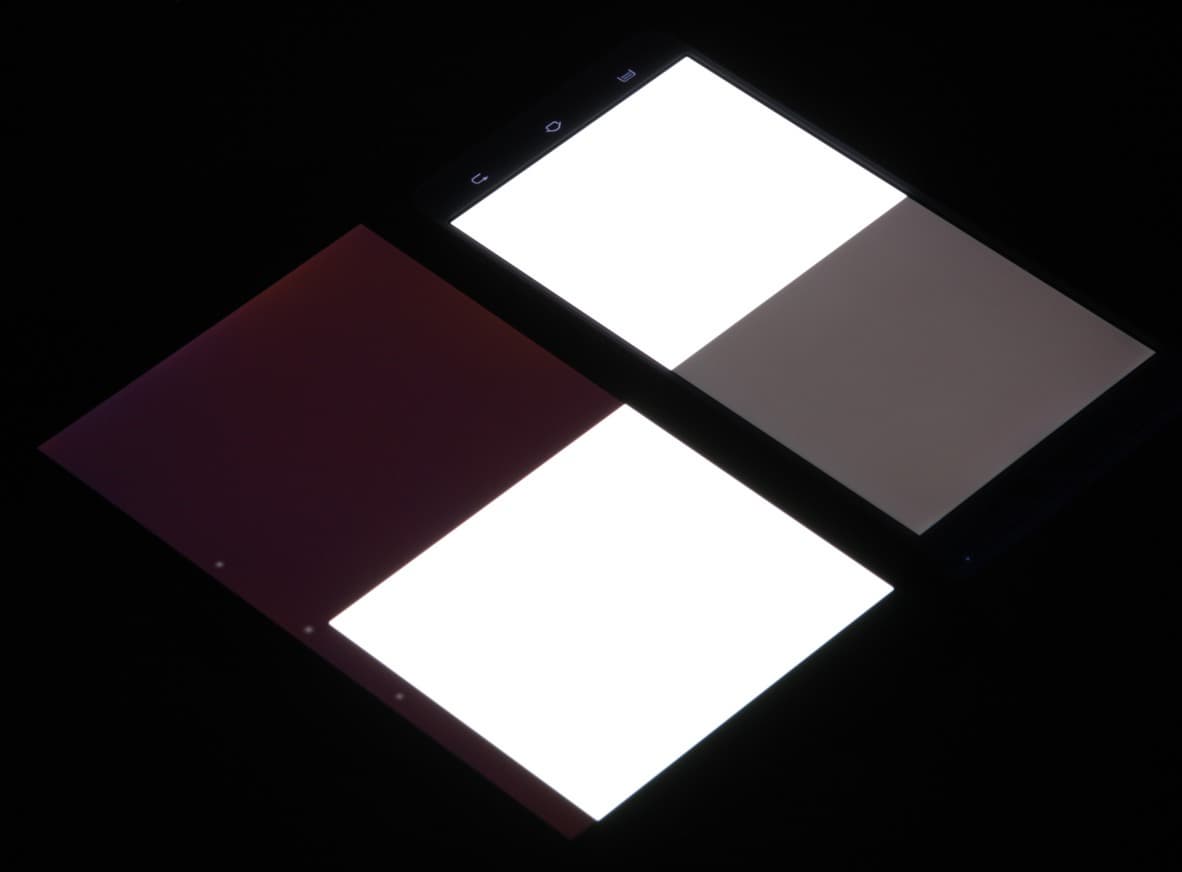 Яркость под углом у экранов уменьшилась (как минимум в пять раз, исходя из разницы в выдержке), однако в случае Vivo Xplay 3S яркость снизилась чуть больше. Черное поле при отклонении по диагонали высветляется сильно и приобретает фиолетовый оттенок или остается примерно нейтрально-серым. Фотографии ниже это демонстрируют (яркость белых участков в перпендикулярном плоскости экранов направлении у экранов одинаковая!):