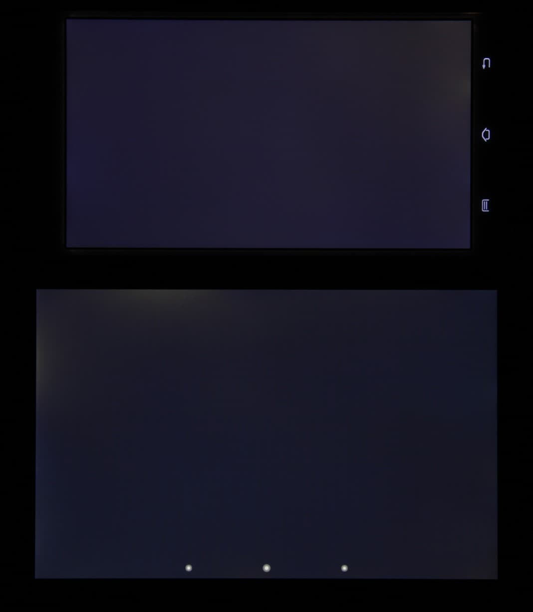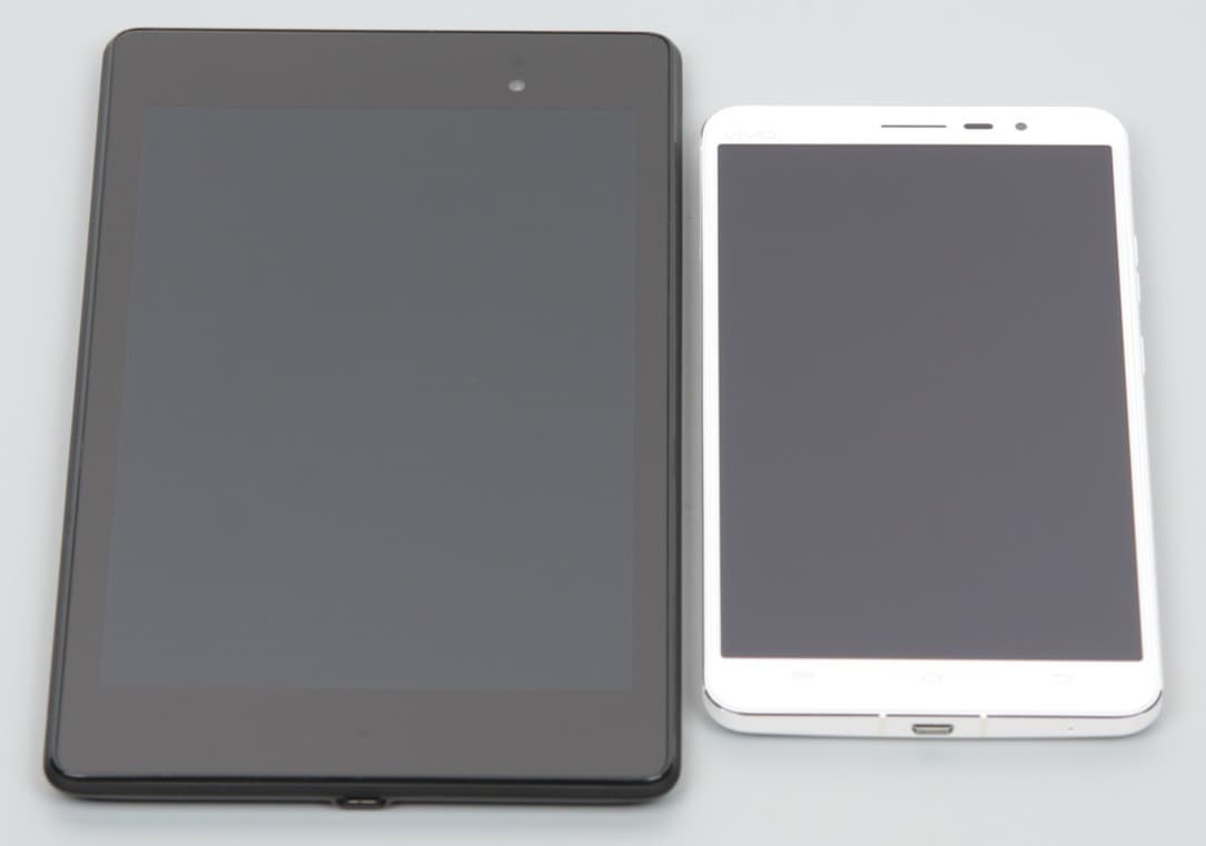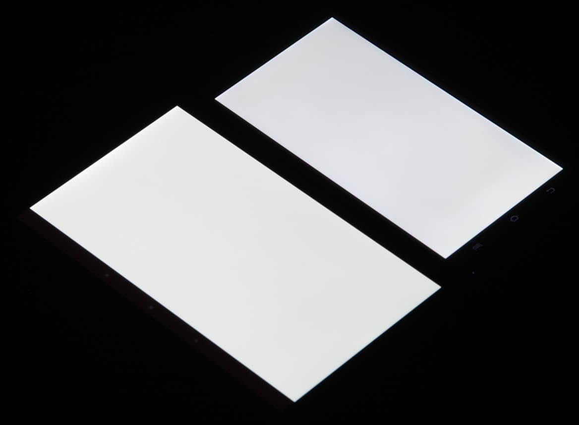 На экран изначально и, скорее всего фабричным способом была наклеена защитная пленка, которую мы удалили. Лицевая поверхность экрана выполнена в виде стеклянной пластины с зеркально-гладкой поверхностью, устойчивой к появлению царапин. Судя по отражению объектов антибликовые свойства экрана не хуже, чем у экрана Google Nexus 7 (2013) (далее просто Nexus 7). Для наглядности приведем фотографию, на которой в выключенных экранах отражается белая поверхность (слева — Nexus 7, справа — Vivo Xplay 3S, далее их можно различать по размеру):