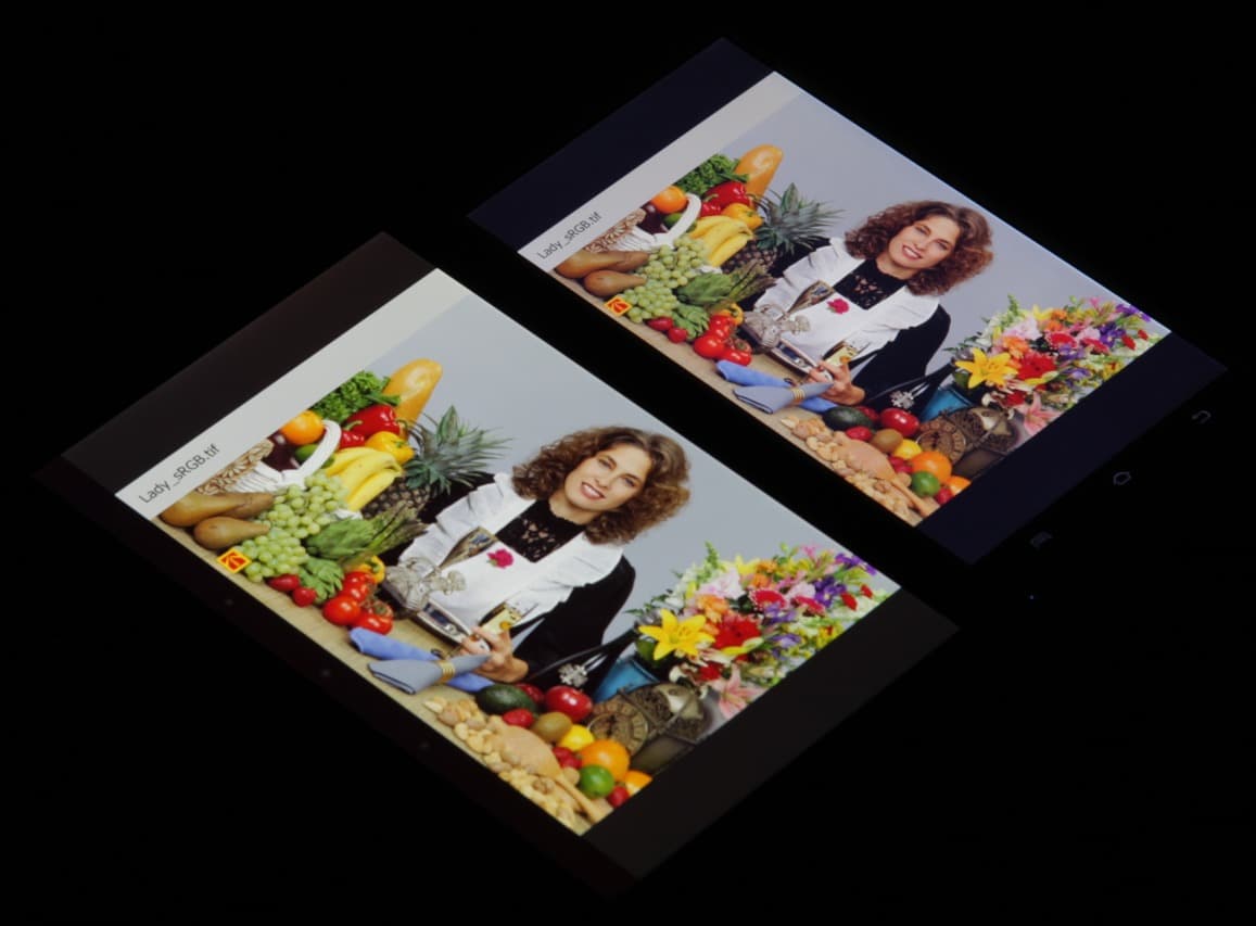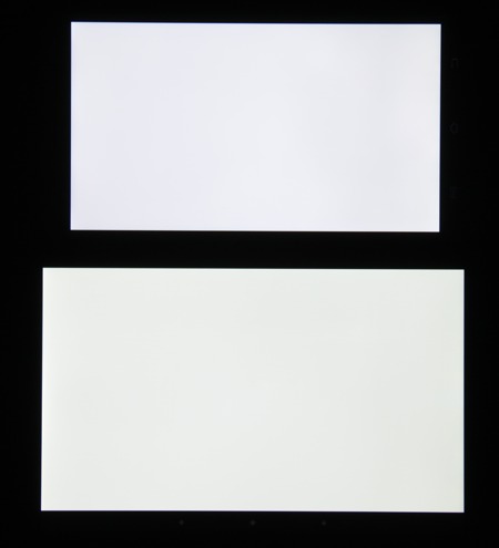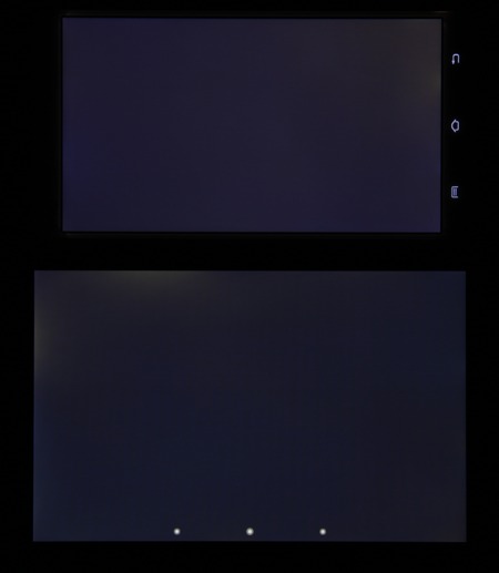 Экран имеет хорошие углы обзора без значительного сдвига цветов даже при больших отклонениях взгляда от перпендикуляра к экрану и без инвертирования оттенков. Для сравнения приведем фотографии, на которых на экраны Vivo Xplay 3S и Nexus 7 выведены одинаковые изображения, при этом яркость экранов изначально установлена примерно на 200 кд/м², а цветовой баланс на фотоаппарате принудительно переключен на 6500 К. Перпендикулярно к экранам белое поле: