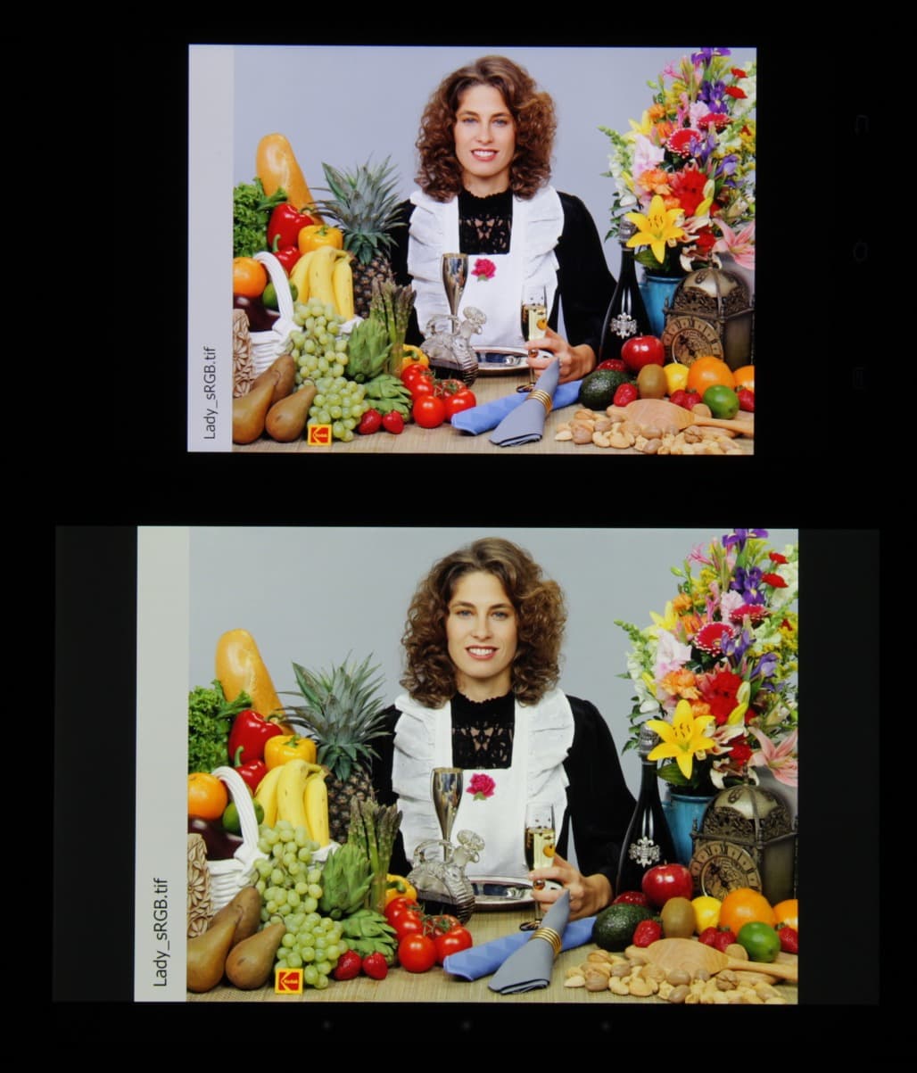 В итоге визуально цвета имеют естественную насыщенность. Баланс оттенков на шкале серого далеко неидеальный, так как цветовая температура заметно выше 6500 К, отклонение от спектра абсолютно черного тела (ΔE) меньше 10, что для потребительского устройства считается приемлемым показателем. Однако при этом ΔE значительно изменяется от оттенка к оттенку — это отрицательно сказывается на визуальной оценке цветового баланса. (Самые темные области шкалы серого можно не учитывать, так как там баланс цветов не имеет большого значения, да и погрешность измерений цветовых характеристик на низкой яркости большая.)