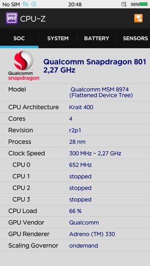 - SoC Qualcomm Snapdragon 801 (MSM8974AB), 4 ядра Krait 400, 2,3 ГГц