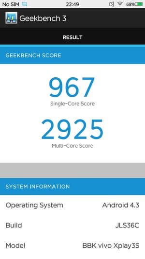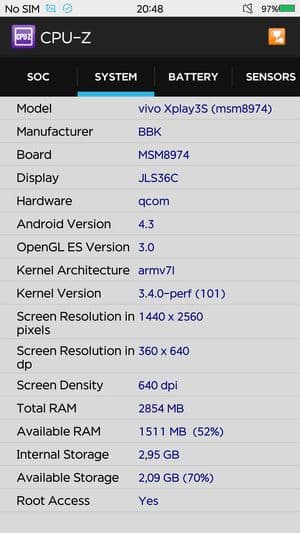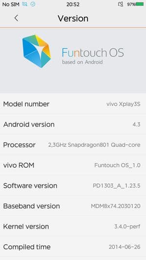Аппаратная платформа Vivo Xplay 3S строится на базе новейшей однокристальной четырехъядерной системы (SoC) Qualcomm Snapdragon 801 с четырьмя ядрами Krait 400. Напомним, что новая платформа обладает функциональностью Snapdragon 800 с чуть большей частотой процессорных ядер: Snapdragon 801 может работать на частотах до 2,46 ГГц, в то время как частота ядер предыдущей версии чипа была ограничена на уровне 2,36 ГГц. Правда, у большинства новых флагманов, в том числе и героя сегодняшнего обзора, максимальная частота процессорных ядер составляет лишь 2,3 ГГц. Это меньше, чем у того же Oppo Find 7, у которого частота ядер поднята до 2,5 ГГц. Такие различия здесь из-за того, что используются разные версии одной и той же новой платформы — в данном случае это MSM8974AВ.