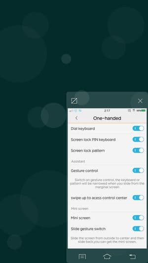 Любопытно выглядит возможность уменьшения в размере самого рабочего пространства экрана: при включении данной функции в углу появляется маленькая копия рабочего стола, до любого уголка которого теперь можно дотянуться пальцем одной руки. Функцию уменьшения можно подключить в настройках или даже вызвать простым встряхиванием смартфона в воздухе.
