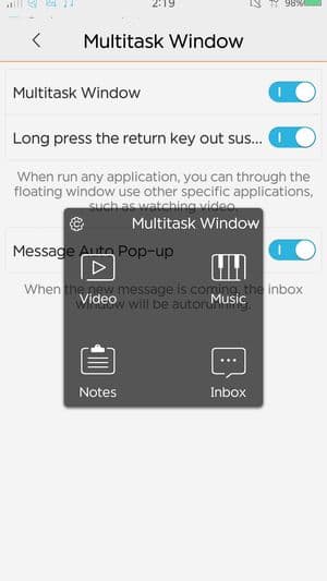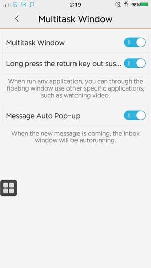 В настройках можно также найти еще одну любопытную функцию, которая выключена по умолчанию: так называемое «окно многозадачности» представляет собой интерактивную кнопку, которую можно установить в любом удобном месте на экране. Эта иконка может по нажатию разворачиваться в контекстное меню с быстрым доступом к почтовому ящику, музыкальному и видеопроигрывателям, а также заметкам.
