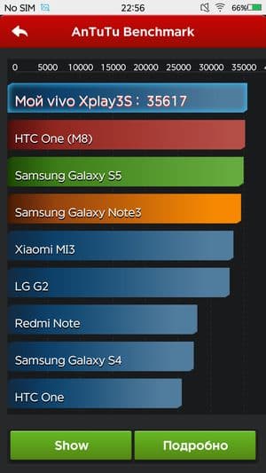 По результатам тестирования смартфон Vivo Xplay 3S приятно удивил наличием полной поддержки всех необходимых декодеров в ее смартфонах. В отличие от большинства рассмотренных аппаратов других фирм, возможностей встроенного видеопроигрывателя здесь хватило для беспроблемного проигрывания всех наших стандартных тестовых роликов. При этом и со звуком никаких проблем не наблюдалось, а в стороннем плеере MX даже не приходится переключаться на аппаратное воспроизведение в режиме Аппаратный+. То есть, говоря проще, данный аппарат безо всяких проблем проиграет любой видеоролик, скачанный из сети.