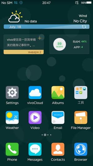 В качестве системы в аппарате используется программная платформа Google Android версии 4.3 и фирменный графический пользовательский интерфейс под названием Funtouch OS. Уже в самом даже названии прослеживается схожесть с аналогичной оболочкой Oppo Color OS, да и по возможностям своим эти программы достаточно схожи — наверняка создатели этих двух программ «подсматривали» за успехами друг друга.