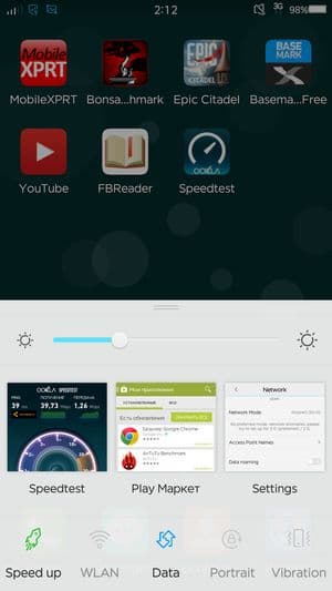 Ниспадающее сверху меню уведомлений здесь не сопряжено, как это сейчас принято, с возможностями быстрого доступа к основным настройкам — для этого есть другое меню, вытягивающееся снизу вверх. В нем пользователь найдет иконки последних запущенных программ, меню быстрого доступа к основным функциям и настройкам, а также ползунок настройки уровня яркости дисплея.