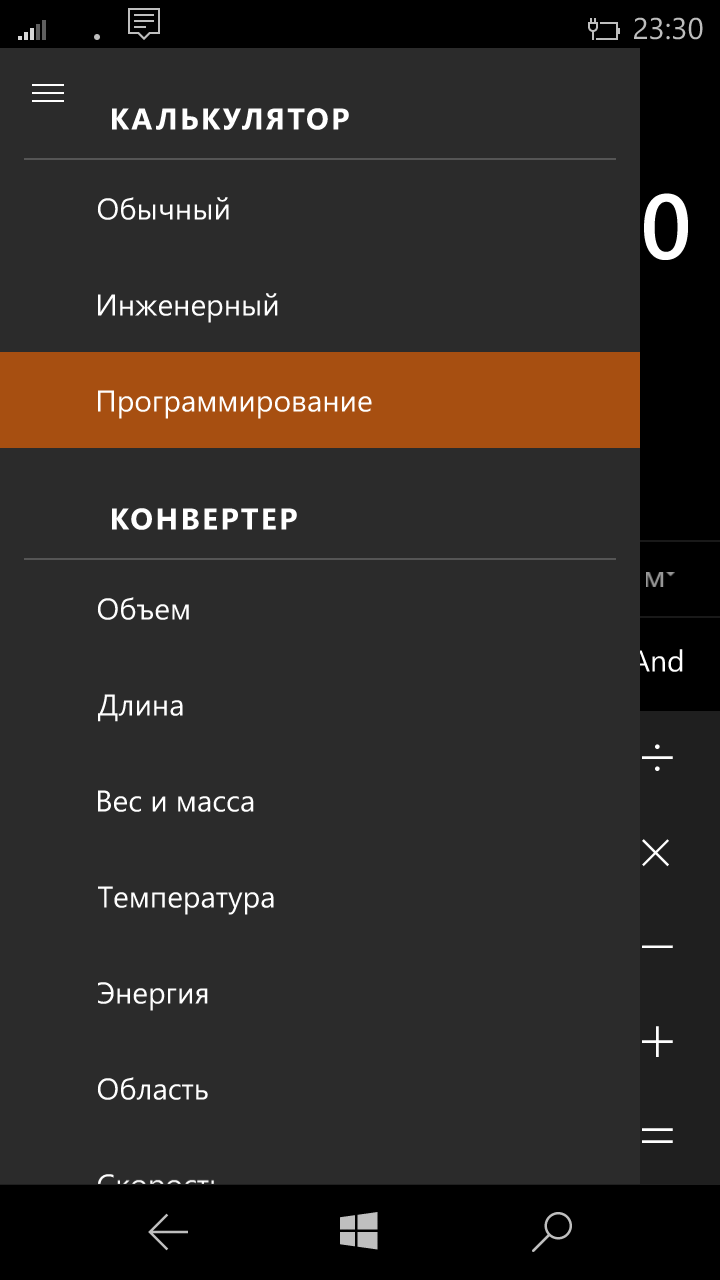Быстро пройдемся по оставшимся приложениям и изменениям, которые они получили. В калькуляторе появился встроенный конвертер единиц измерения. Дизайн приложения был изменен, добавились два режима работы (как у настольного собрата): инженерный и программирование.