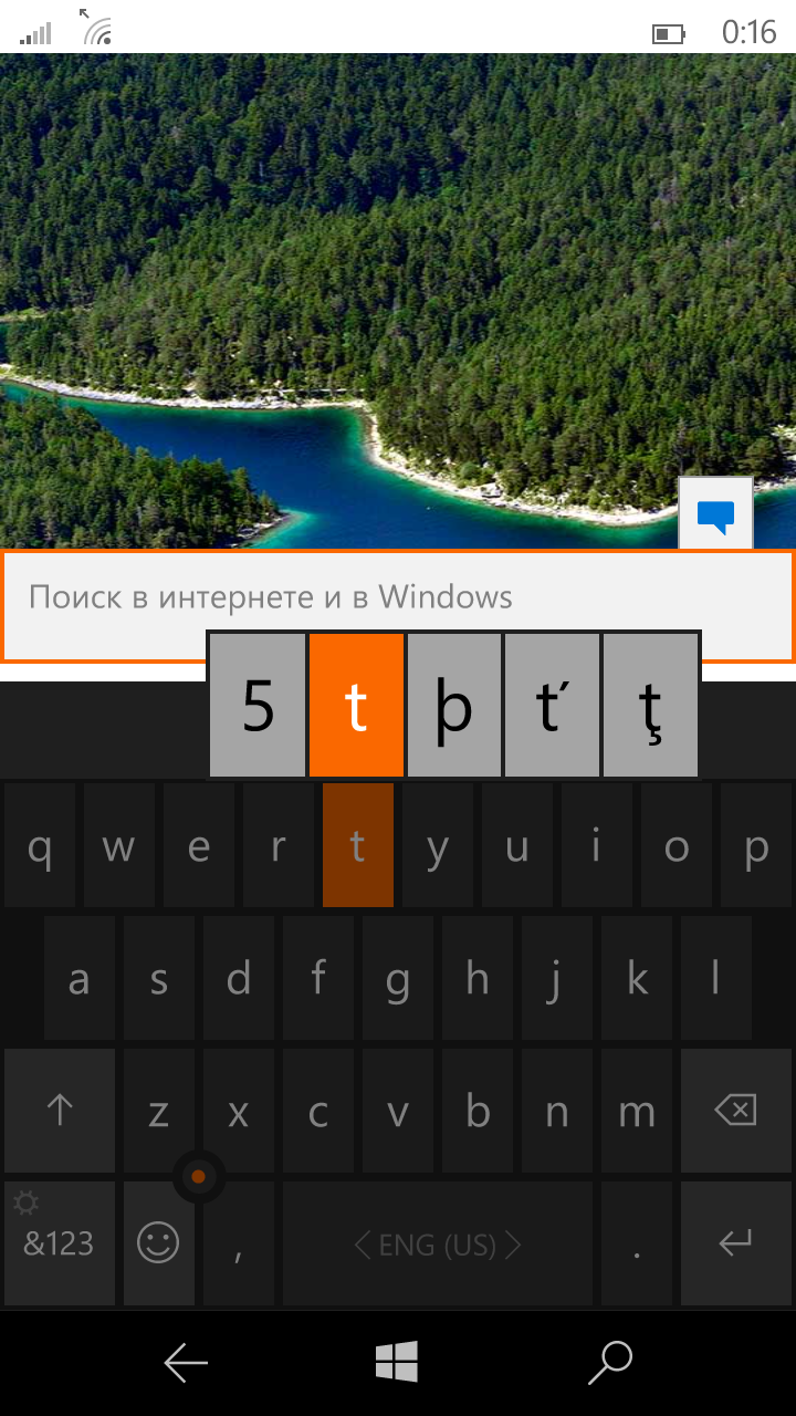 И еще одно нововведение в экранной клавиатуре Windows 10 Mobile — быстрый набор цифр и символов диакритики. Для того чтобы появились дополнительные знаки, нужно удерживать полсекунды клавиши верхнего ряда латинской клавиатуры (QWERTYUIOP). Быстрый ввод цифр и знаков при раскладке клавиатуры кириллицей пока не поддерживается.
