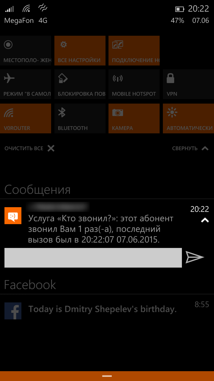 Значительные улучшения получил центр уведомлений. Увеличилось количество настроек в верхней его части, но чтобы увидеть их полный список, необходимо коснуться отдельной иконки. Быстрый вызов полного списка настроек движением двумя пальцами, как это сделано на некоторых смартфонах с Android, недоступен. Долгое касание значка теперь вызывает соответствующее окно настроек смартфона — удобная функция, учитывая, какое разветвленное и запутанное меню параметров в Windows 10 Mobile.