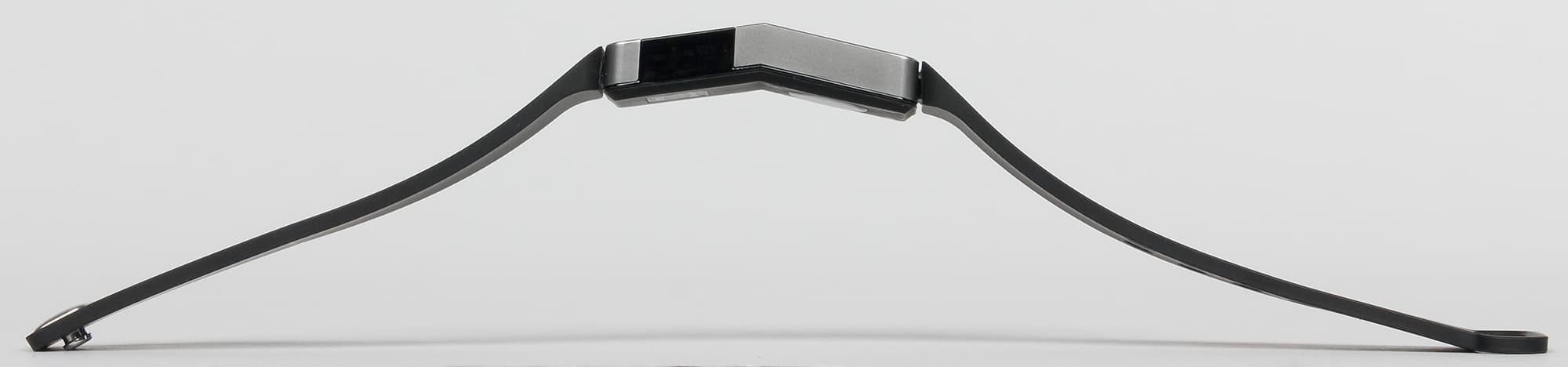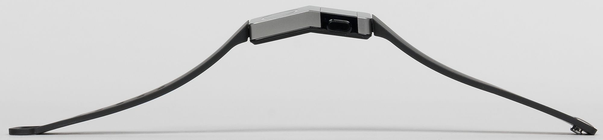 Корпус устройства имеет необычную форму: представьте себе маленькую шоколадку, которую надломили посередине. Вот здесь мы видим нечто подобное. Такая форма позволяет браслету более плотно прилегать к руке и, вдобавок, выглядит интереснее, чем если бы это был просто ровный брусочек.