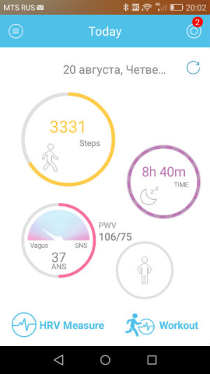После стандартной процедуры заполнения данных о себе и регистрации мы видим главный экран приложения, на котором отображаются четыре круга. Самый большой — это количество шагов за день, два круга поменьше — это время сна и «возраст ВНС» (что это такое — мы поговорим далее). Наконец, нижний круг — это список всех тренировок с краткими сведениями о каждой. Если мы кликнем на один из трех верхних кругов, то откроется экран Trends, где будут сводки по активности, сну и измерению пульса / «возраста ВНС» / давления.