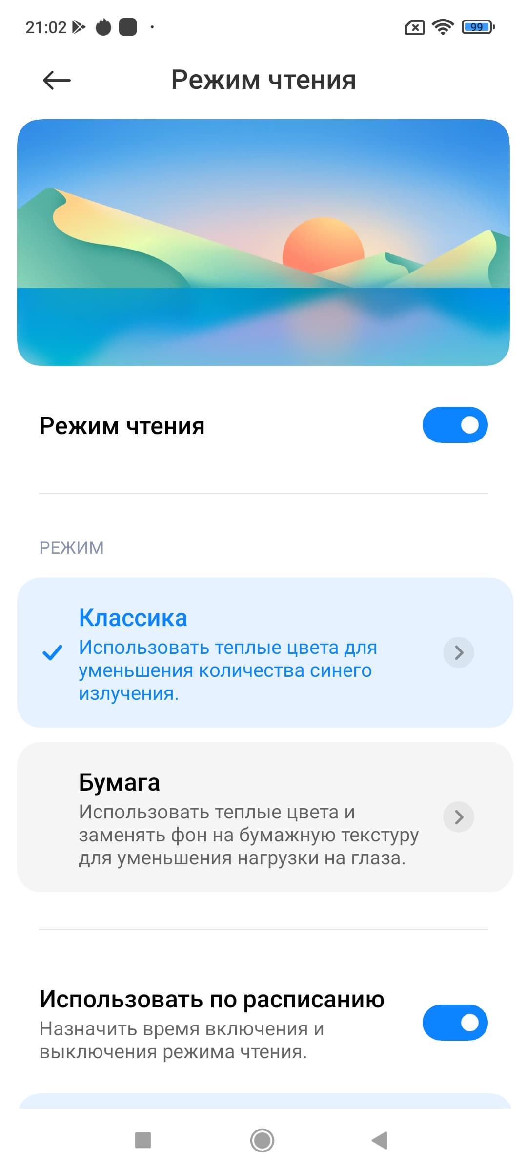 Конечно, есть режим с уменьшенной интенсивностью синей компоненты. Напомним, что, в принципе, яркий свет может приводить к нарушению суточного (циркадного) ритма (см. статью про iPad Pro с дисплеем 9,7 дюйма), но все решается снижением яркости до низкого, но еще комфортного уровня, а искажать цветовой баланс, уменьшая вклад синего, нет абсолютно никакого смысла.