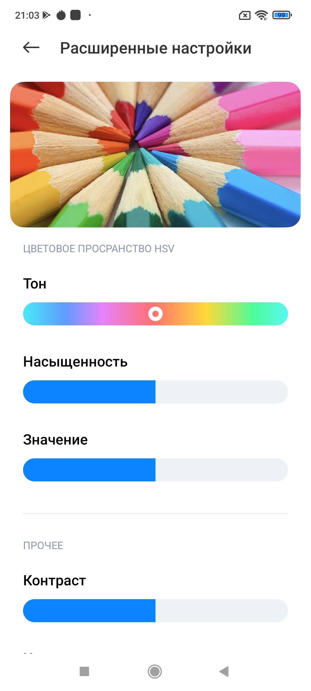 Присутствует функция Адаптивные цвета, которая, если ее включить, подстраивает цветовой баланс под условия окружающей среды. Мы включили эту функцию и проверили, как она работает (профиль Яркий):