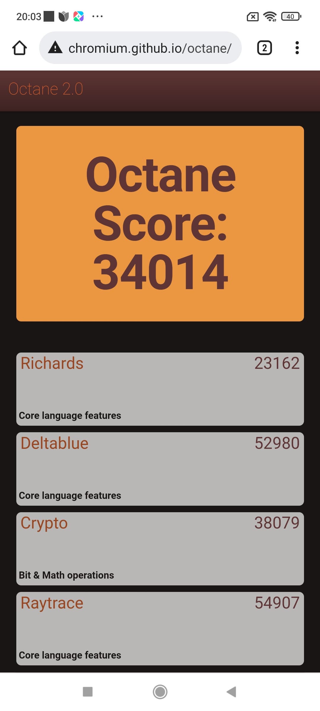 | Google Octane 2 (больше — лучше) | 34014 | 48983 | 14293 | 25832 | 21754 |