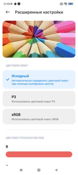 Фотография выше получена для профиля Яркий в настройках экрана. Базовых профилей три, а в четвертом можно вручную выбирать коррекцию цветового охвата, менять цветовой баланс многочисленными настройками и т.д: