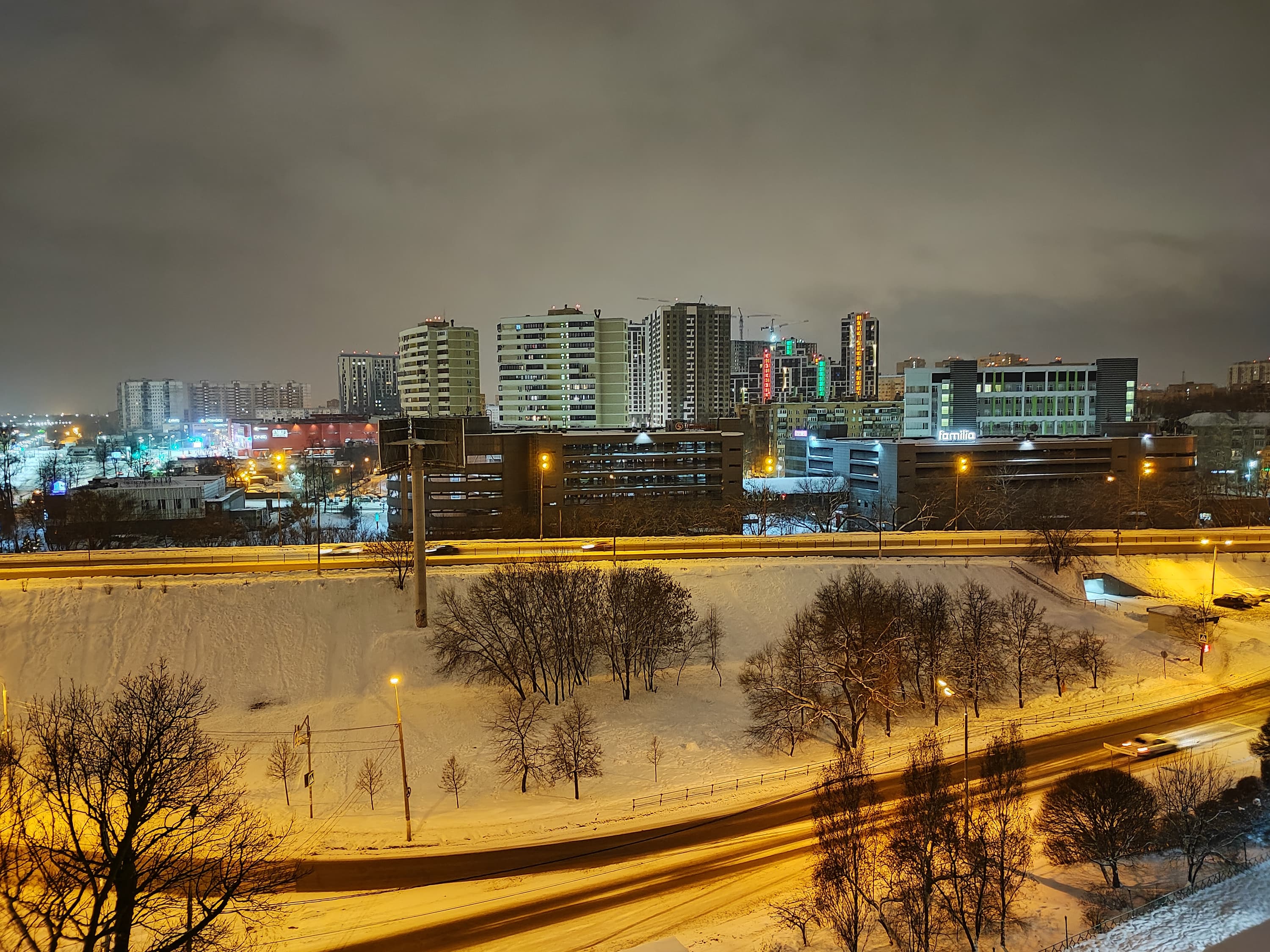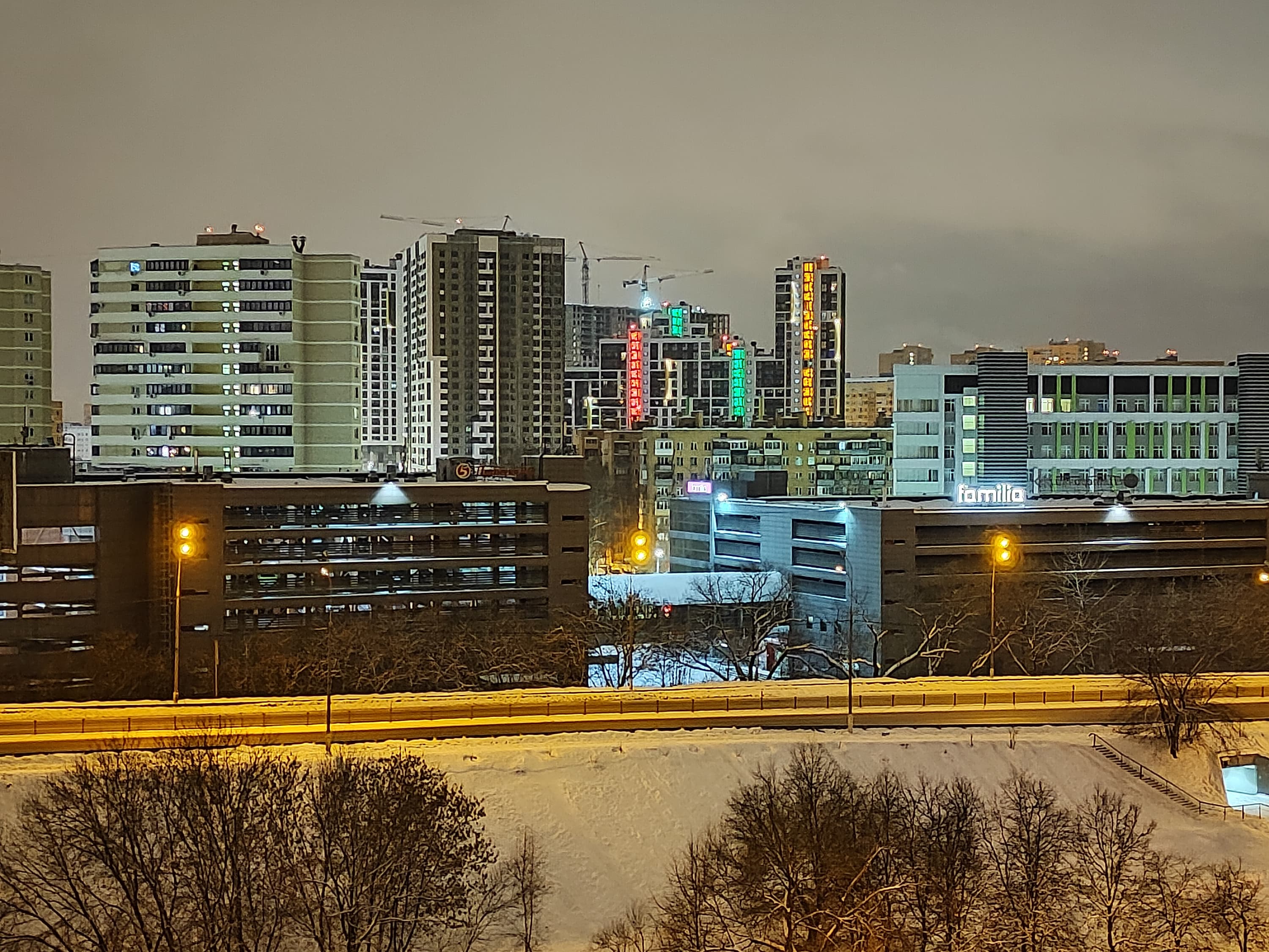 Ночной режим съемки доступен для всех трех значений «фокусных расстояний», но хорошие снимки можно сделать только на основную камеру. Кстати, в случае хорошо освещенного ночного пейзажа можно предпочесть использование обычного режима, потому что при принудительном включении ночного режима камера довольно сильно задирает экспозицию, преображая снимок почти в дневной.