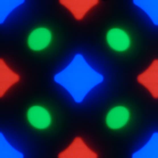 В этом экране используется матрица Super AMOLED — активная матрица на органических светодиодах. Полноцветное изображение создается с помощью субпикселей трех цветов — красного (R), зеленого (G) и синего (B), но красных и синих субпикселей в два раза меньше, что можно обозначить как RGBG. Это подтверждается фрагментом микрофотографии: