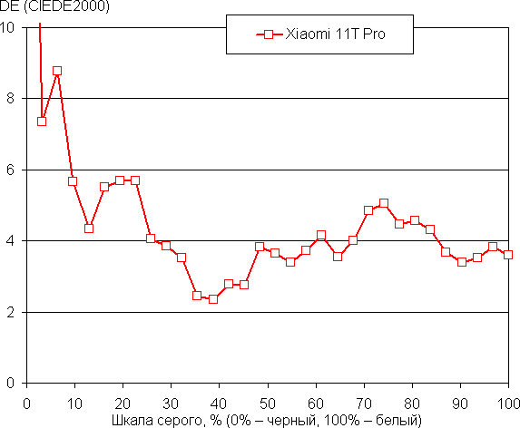 Напомним, что в случае OLED-экранов яркость фрагментов изображения динамично меняется в соответствии с характером выводимого изображения — немного уменьшается для светлых в целом изображений. В итоге полученная зависимость яркости от оттенка (гамма-кривая), скорее всего, не соответствует гамма-кривой статичного изображения, так как измерения проводились при последовательном выводе оттенков серого почти на весь экран.