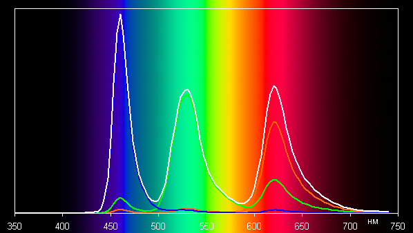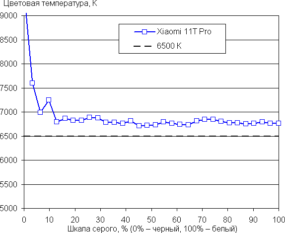 При выборе профиля Стандарт баланс оттенков на шкале серого приемлемый, поскольку цветовая температура близка к стандартным 6500 К, а отклонение от спектра абсолютно черного тела (ΔE) на большей части шкалы серого ниже 10, что для потребительского устройства считается неплохим показателем. При этом цветовая температура и ΔE мало изменяются от оттенка к оттенку — это положительно сказывается на визуальной оценке цветового баланса. (Самые темные области шкалы серого можно не учитывать, так как там баланс цветов не имеет большого значения, да и погрешность измерений цветовых характеристик на низкой яркости большая.)