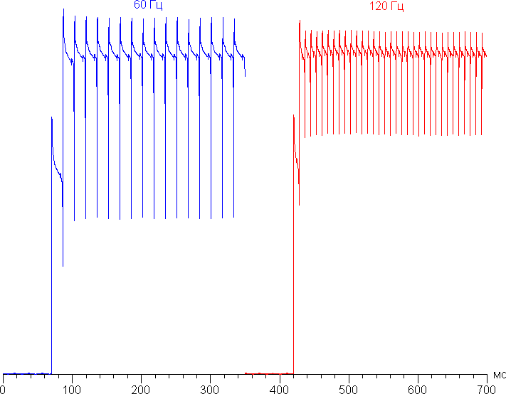 В режиме 120 Гц плавность прокрутки списков в меню заметно повышается. Посмотрим, изменится ли при этом характер модуляции: