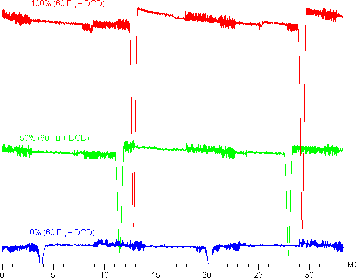 Видно, что на высокой и средней яркости частота модуляции увеличилась в 2 раза, а на низкой яркости характер модуляции не изменился. Отметим, что частота обновления 120 Гц устанавливается, только если на экран выводится динамическое изображение.