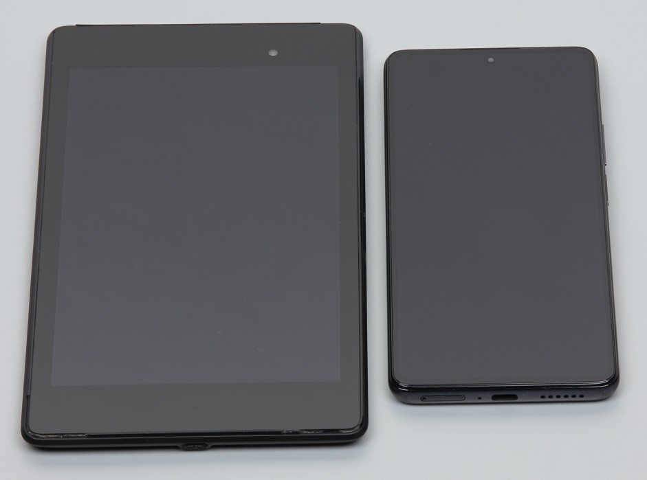 Лицевая поверхность экрана выполнена в виде стеклянной пластины с зеркально-гладкой поверхностью, устойчивой к появлению царапин. Судя по отражению объектов, антибликовые свойства экрана лучше, чем у экрана Google Nexus 7 (2013) (далее просто Nexus 7). Для наглядности приведем фотографию, на которой в выключенных экранах отражается белая поверхность (слева — Nexus 7, справа — Xiaomi 11T Pro, далее их можно различать по размеру):