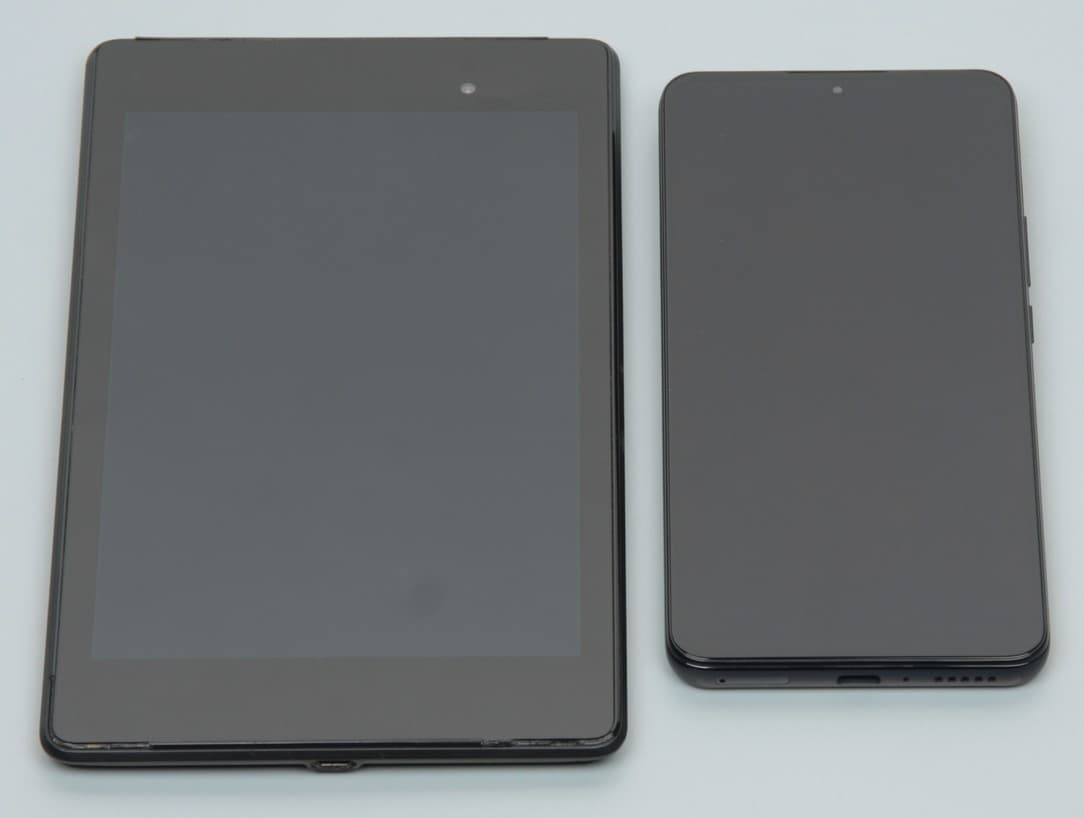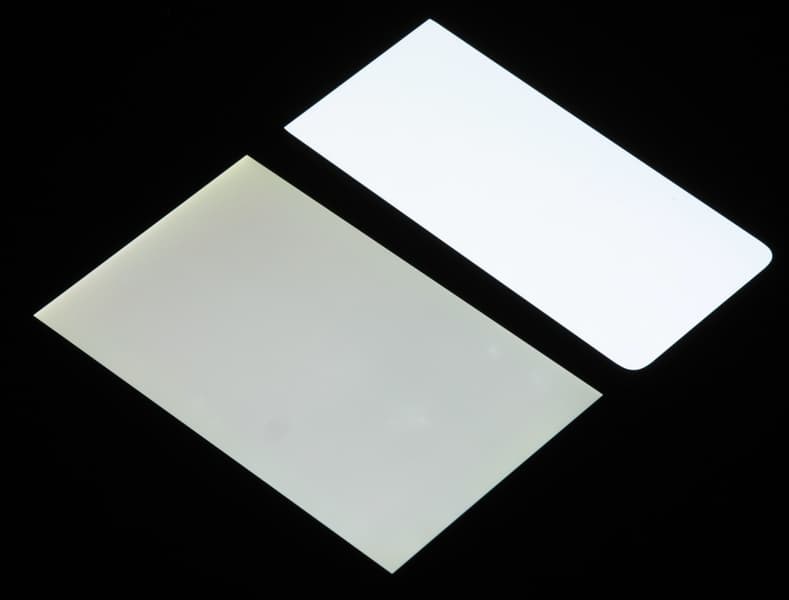 Лицевая поверхность экрана выполнена в виде стеклянной пластины с зеркально-гладкой поверхностью, устойчивой к появлению царапин. Судя по отражению объектов, антибликовые свойства экрана лучше, чем у экрана Google Nexus 7 (2013) (далее просто Nexus 7). Для наглядности приведем фотографию, на которой в выключенных экранах отражается белая поверхность (слева — Nexus 7, справа — Xiaomi 12T Pro, далее их можно различать по размеру):