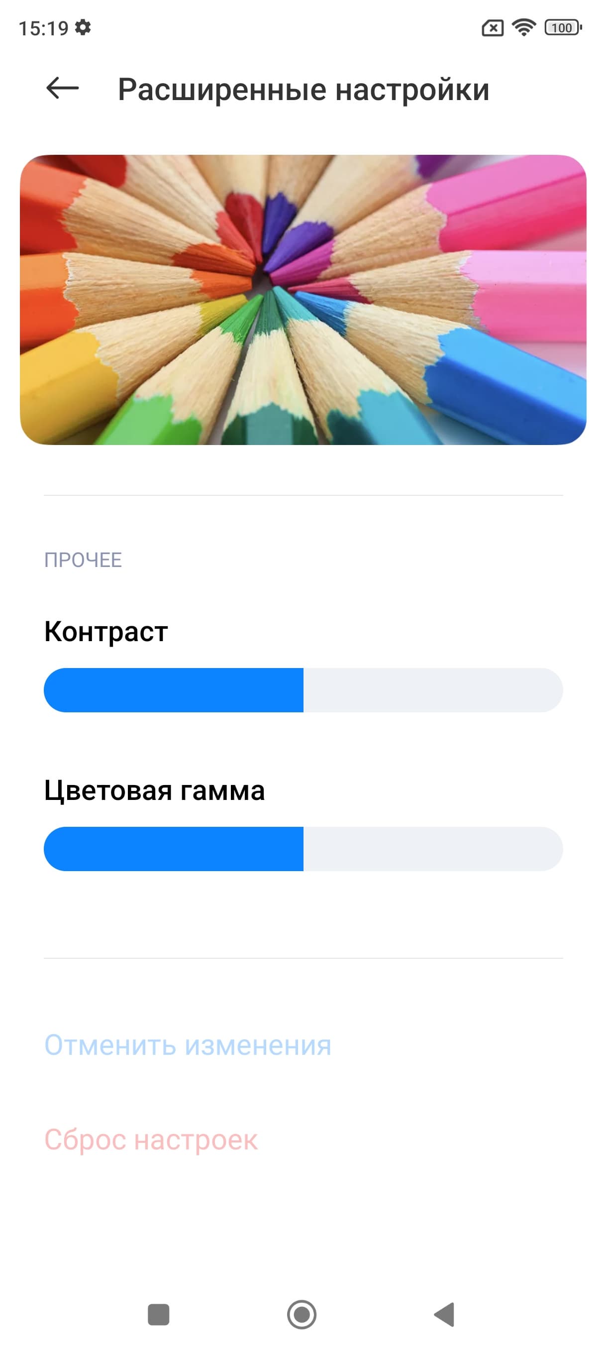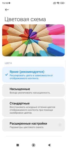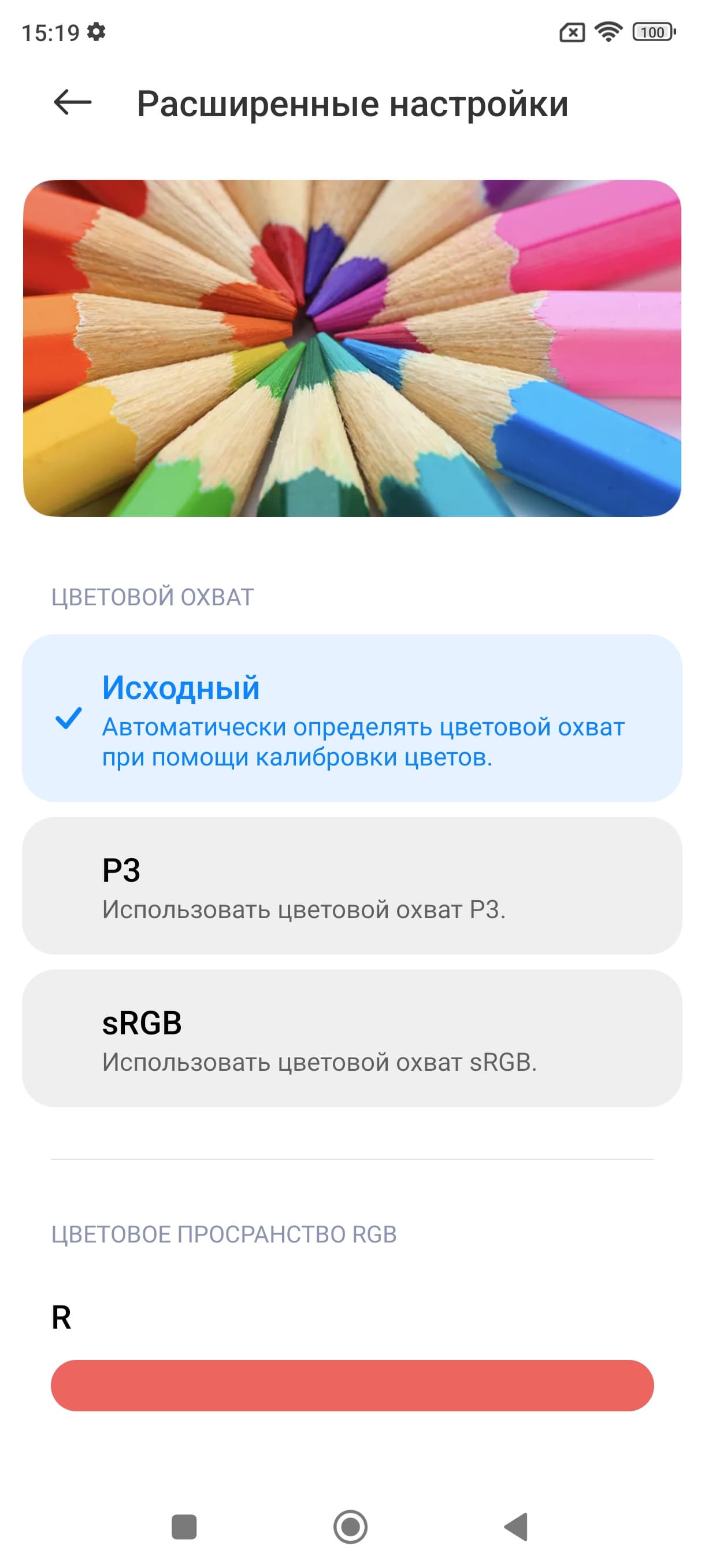 Фотография выше получена для профиля Яркие в настройках экрана. Базовых профилей три, а в четвертом можно вручную выбирать коррекцию цветового охвата, менять цветовой баланс многочисленными настройками и т. д.: