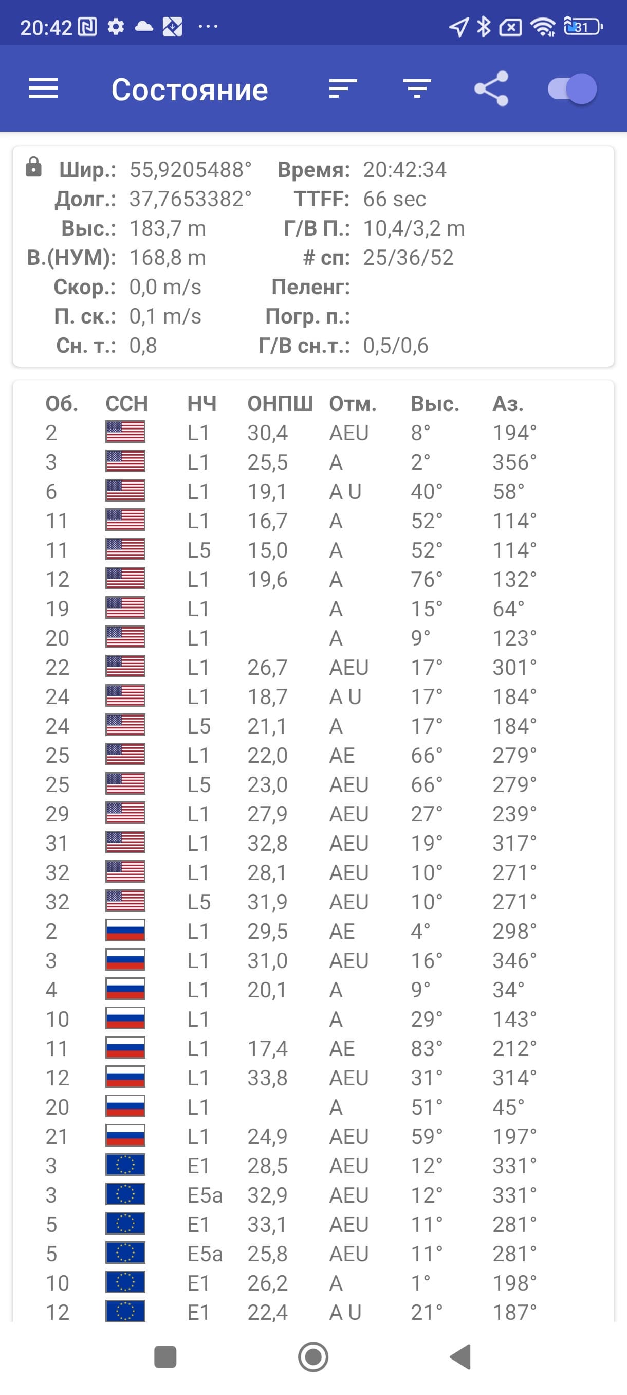 Двухдиапазонный модуль спутниковой навигации работает с GPS (L1+L5), Глонасс (L1), BDS (B1I+B1c+B2a), GALILEO (E1+E5a), QZSS (L1+L5), NavIC (L5). Первые спутники при холодном старте обнаруживаются быстро, точность позиционирования не вызывает претензий.