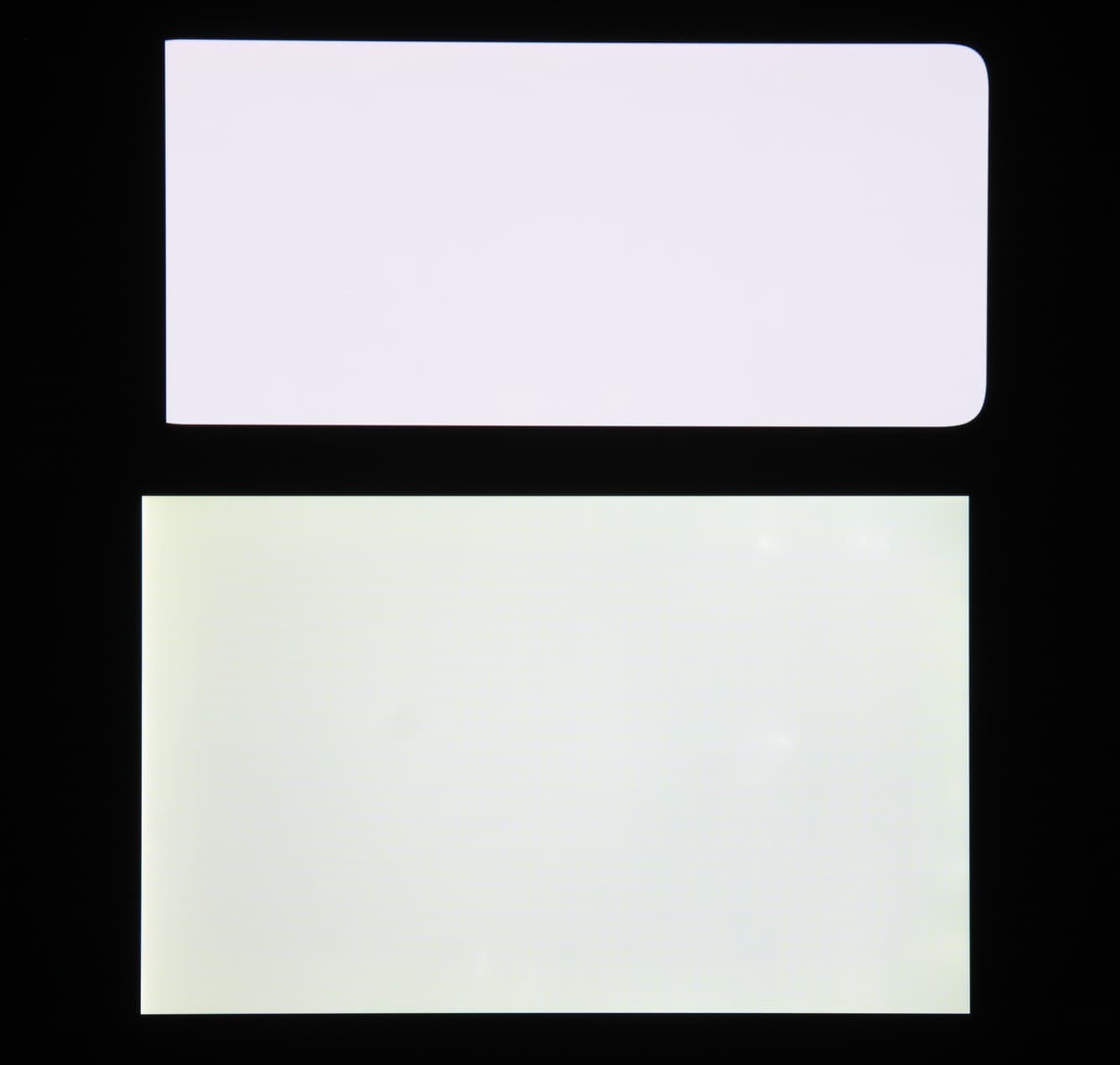 Экран характеризуется великолепными углами обзора. Правда, белый цвет при отклонении на большие углы приобретает легкий сине-зеленый оттенок, но черный цвет остается просто черным под любыми углами. Он настолько черный, что параметр контрастности в данном случае неприменим. Для сравнения приведем фотографии, на которых на экраны Xiaomi 12T Pro и Nexus 7 выведены одинаковые изображения, при этом яркость экранов изначально установлена примерно на 200 кд/м², а цветовой баланс на фотоаппарате принудительно переключен на 6500 К.