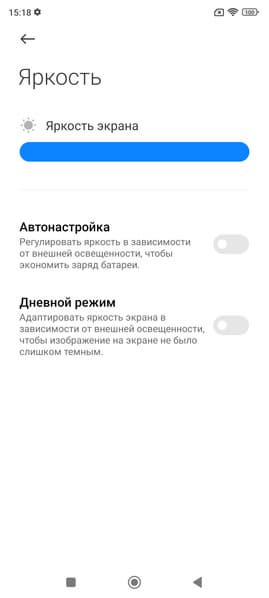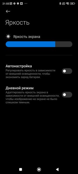 Минимальное значение яркости — 2 кд/м², поэтому в полной темноте яркость можно понизить до комфортного значения. В наличии автоматическая регулировка яркости по датчику освещенности (он находится на фронтальной панели близко к ее верхнему краю правее решетки фронтального громкоговорителя). В автоматическом режиме при изменении внешних условий освещенности яркость экрана как повышается, так и понижается. Работа этой функции зависит от положения ползунка регулировки яркости: им пользователь может попытаться выставить желаемый уровень яркости в текущих условиях. Если не вмешиваться, то в полной темноте функция автояркости уменьшает яркость до 4 кд/м² (низковато), в условиях освещенного искусственным светом офиса (примерно 550 лк) устанавливает на 100 кд/м² (нормально), а условно на прямом солнечном свету яркость достигает 915 кд/м² (до максимума, так и нужно). Результат нас не устроил, поэтому в полной темноте мы увеличили яркость до 15 кд/м², получив для трех условий, указанных выше, следующие значения: 15, 110, 915 кд/м² (что и было нужно). Получается, что функция автоподстройки яркости работает адекватно и в какой-то степени позволяет пользователю настраивать свою работу под индивидуальные требования.