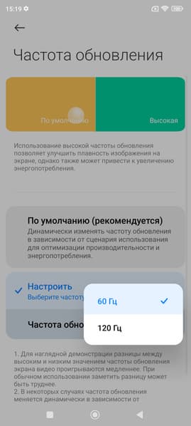 В настройках экрана можно включить режим с повышенной до 120 Гц частотой обновления: